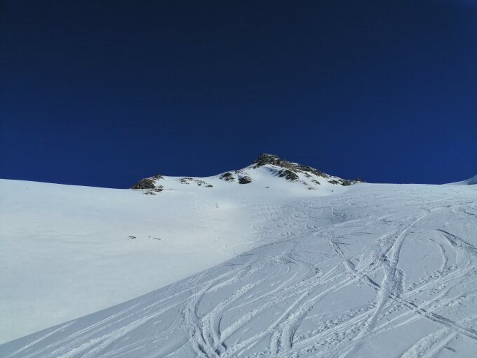 Bergauf mit den Skis ab Matt, dank der vorbereiteten Schlittelbahn (Eis). Sehr harter Schnee/Eis bis Winggel. Dann Bruchharsch Schnee, Spuren von letzten Tagen ganz gefroren. Pulver Schnee ab ca.2200m und bis zur Spitze. Ca. 30m-lang Schneebrett unten Märenblanggen (wo es am steilsten ist) fängt an zurutschen, aufpassen!