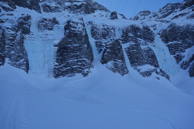 Aufgrund der kalten Tage mit anhaltend zweistelligen Minusgraden teilweise hartes, sprödes Eis. Aufgrund sehr weniger Begehungen in den letzten Wochen kaum ausgepickeltes Eis. Es gingen überhaupt nur Spuren zum Breiten Fall und zum linken Couloir, der Rest lag unberührt da; also kein Vergleich zu Sertig.