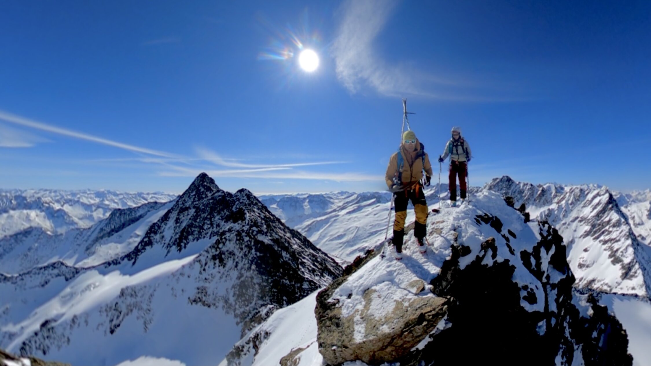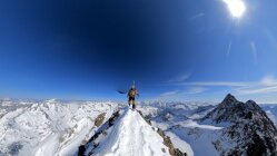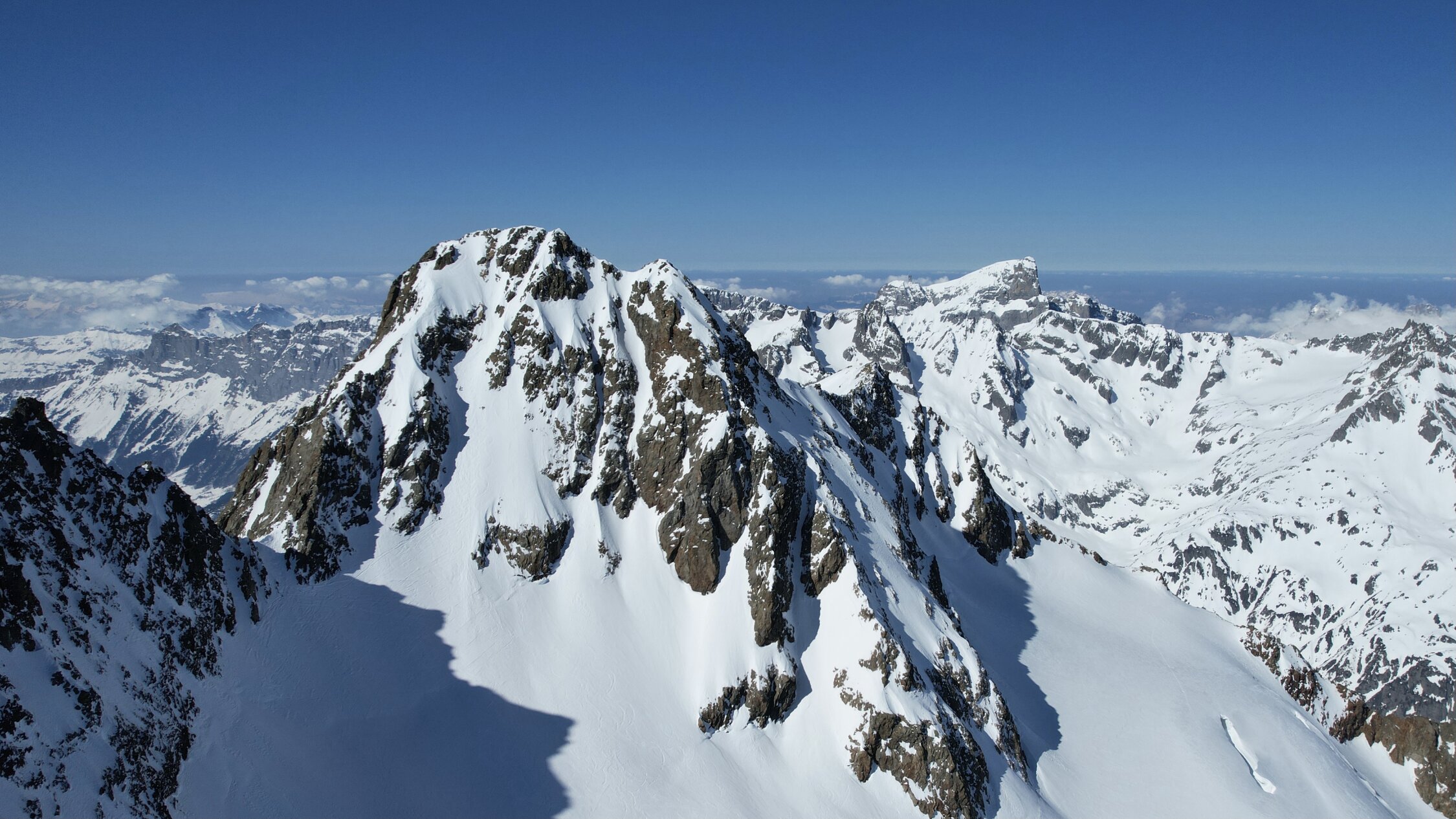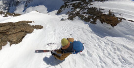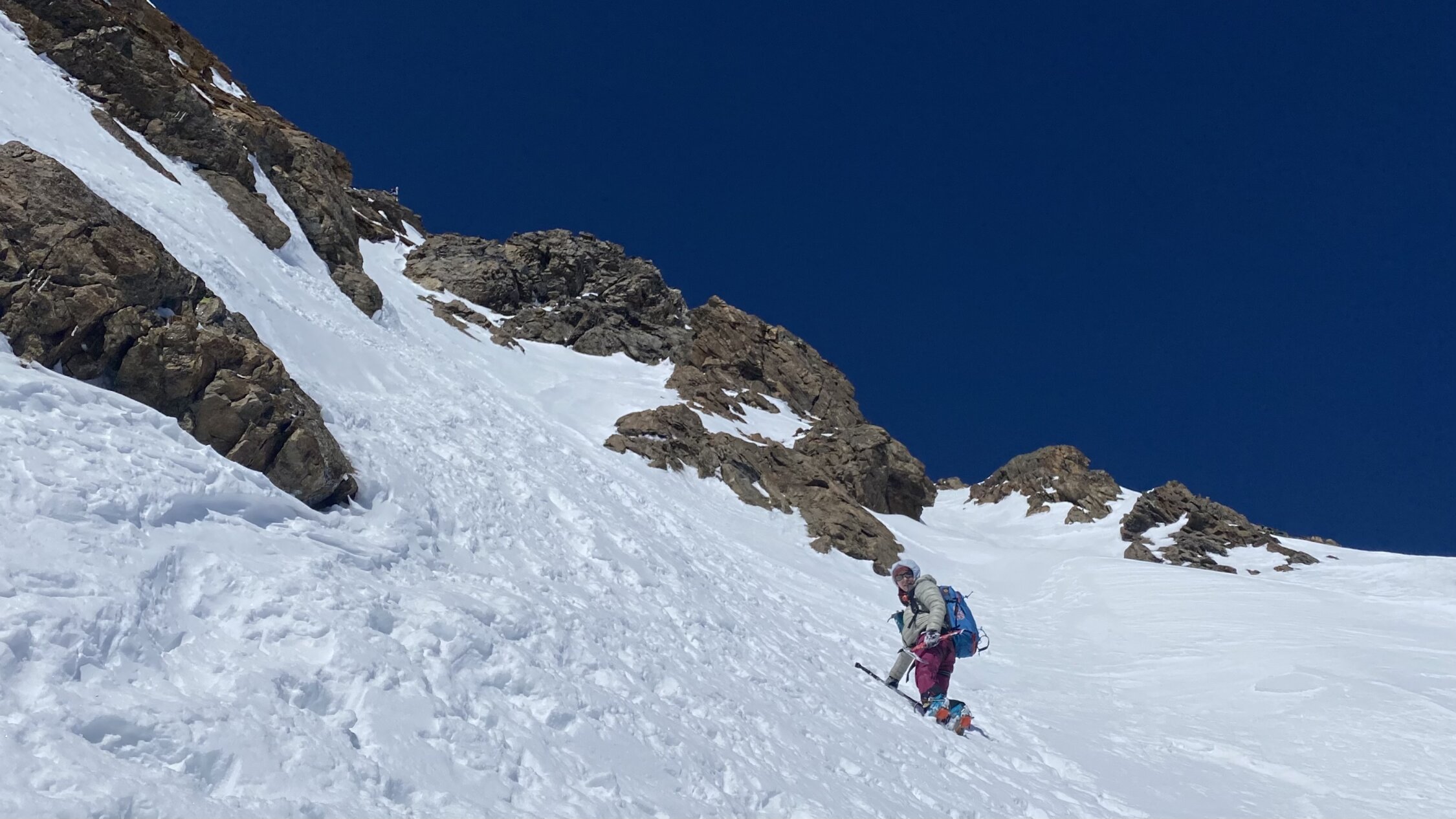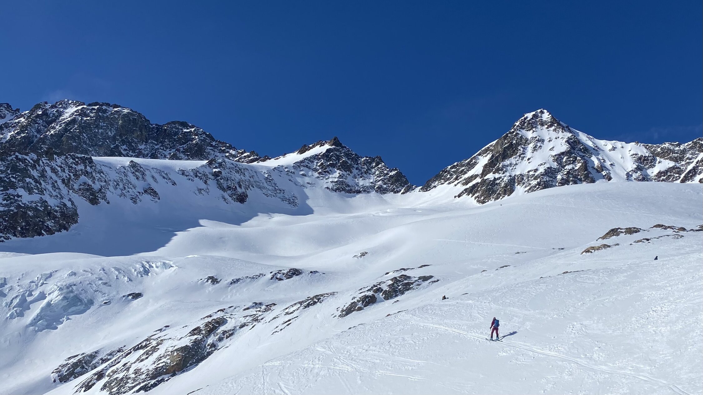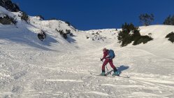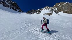 Ab Skidepot zwei Varianten, entweder die normale Route über den Grat, oder aktuell das zweite nördliche Couloir (das erste, zu wenig Schnee). Im Couloir perfekter Trittschnee, gute Spur drin, aber kurze Stellen 48 Grad (gemessen). Ist deutlich Zeitsparender als über den Grat. Die Verhältnisse sind darin so gut, das ich es mir nicht nehmen lies, darin abzufahren.