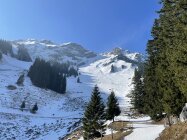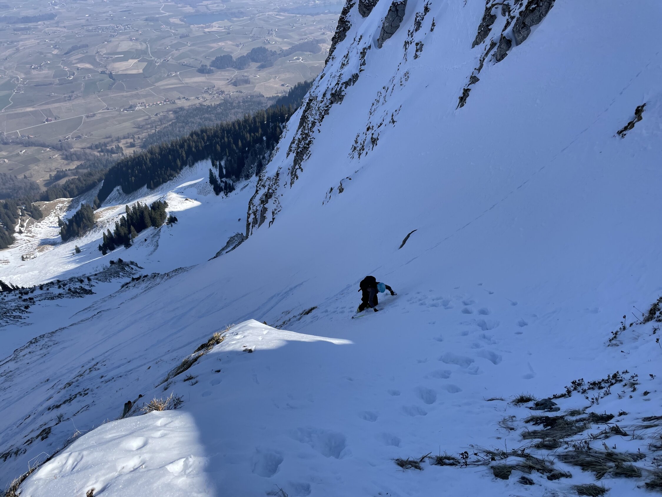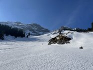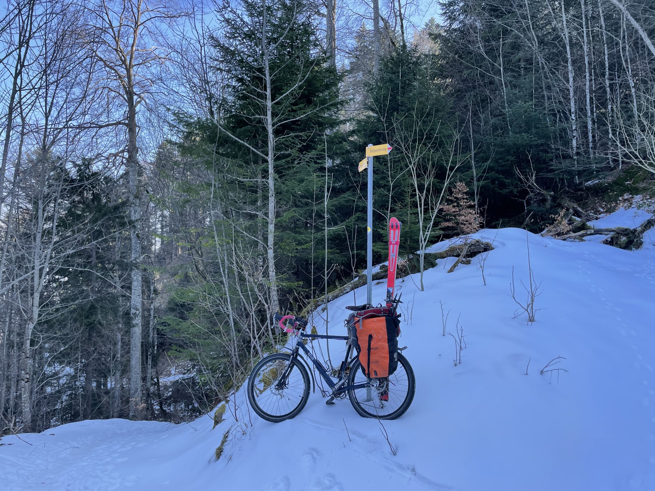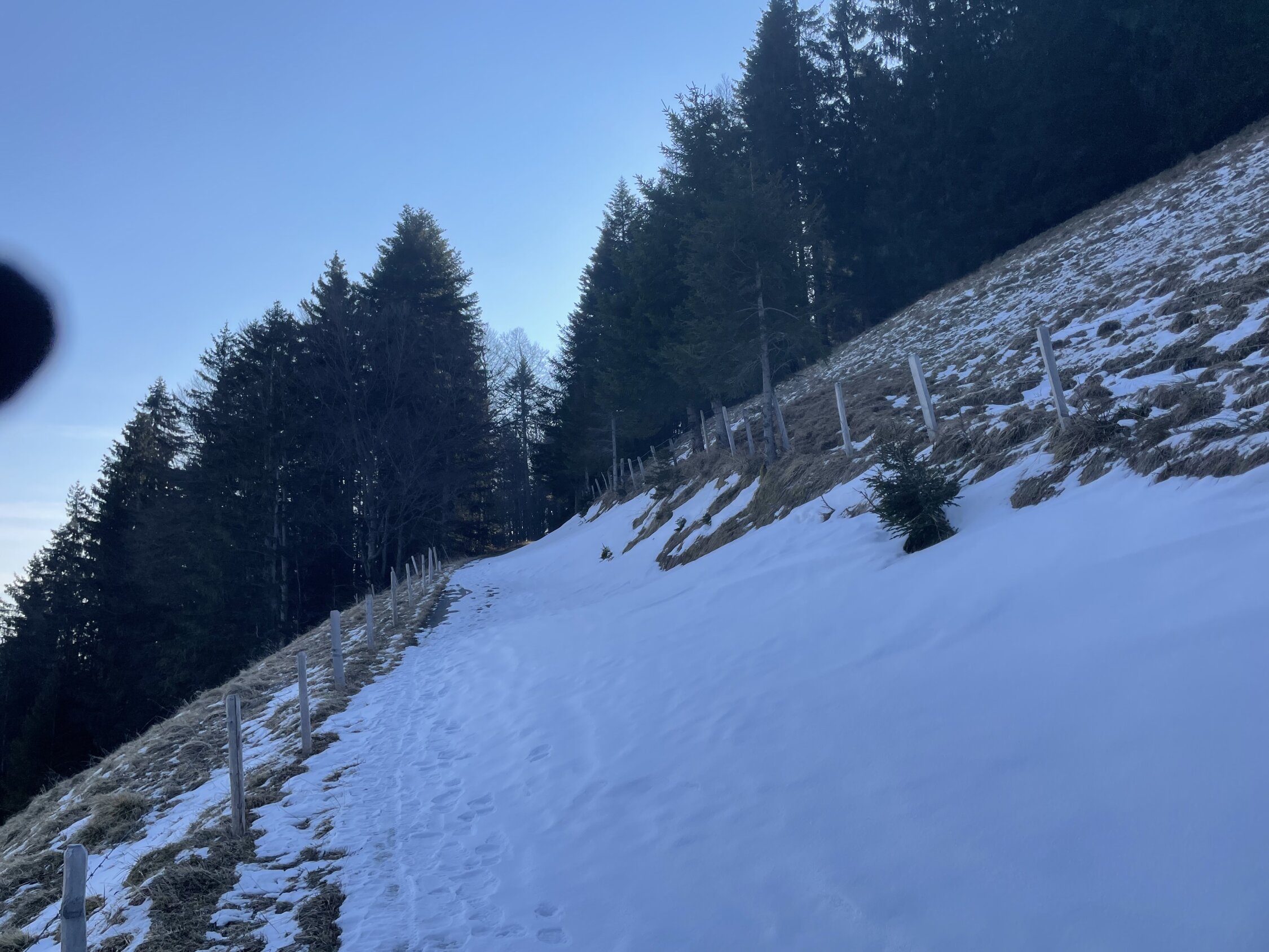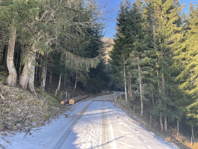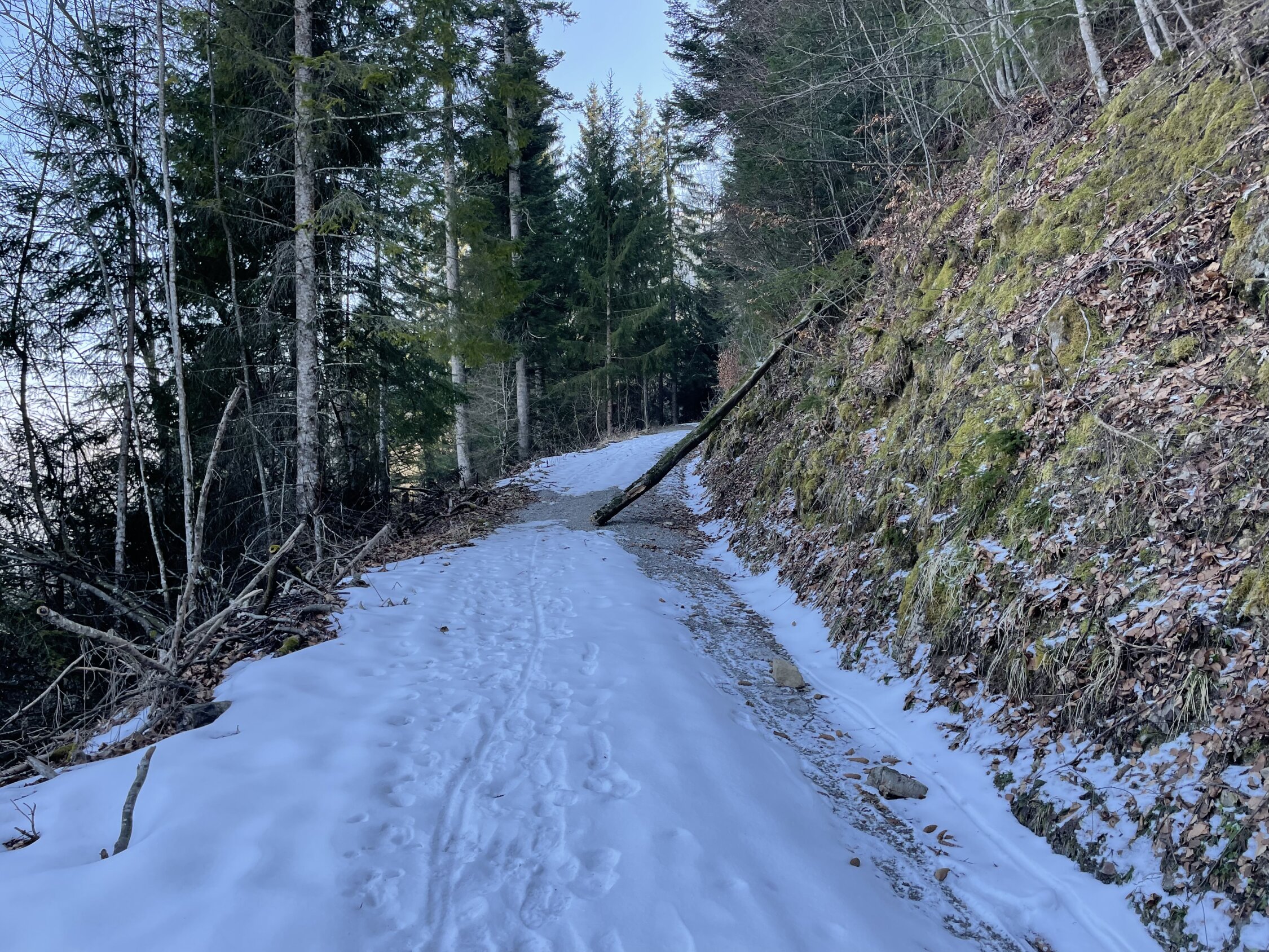 Abfahrt passabel, wobei es nur 5-10 cm lockeren Schnee auf der Hartschneeschicht hat. Unten muss man schon etwas aufpassen um keinen Stein zu erwischen. Auf dem Forstweg bis zum Velo, nur 3 kurze Stellen abgezogen.