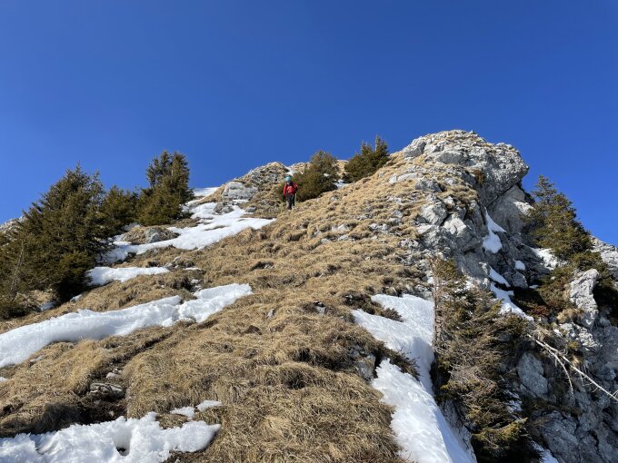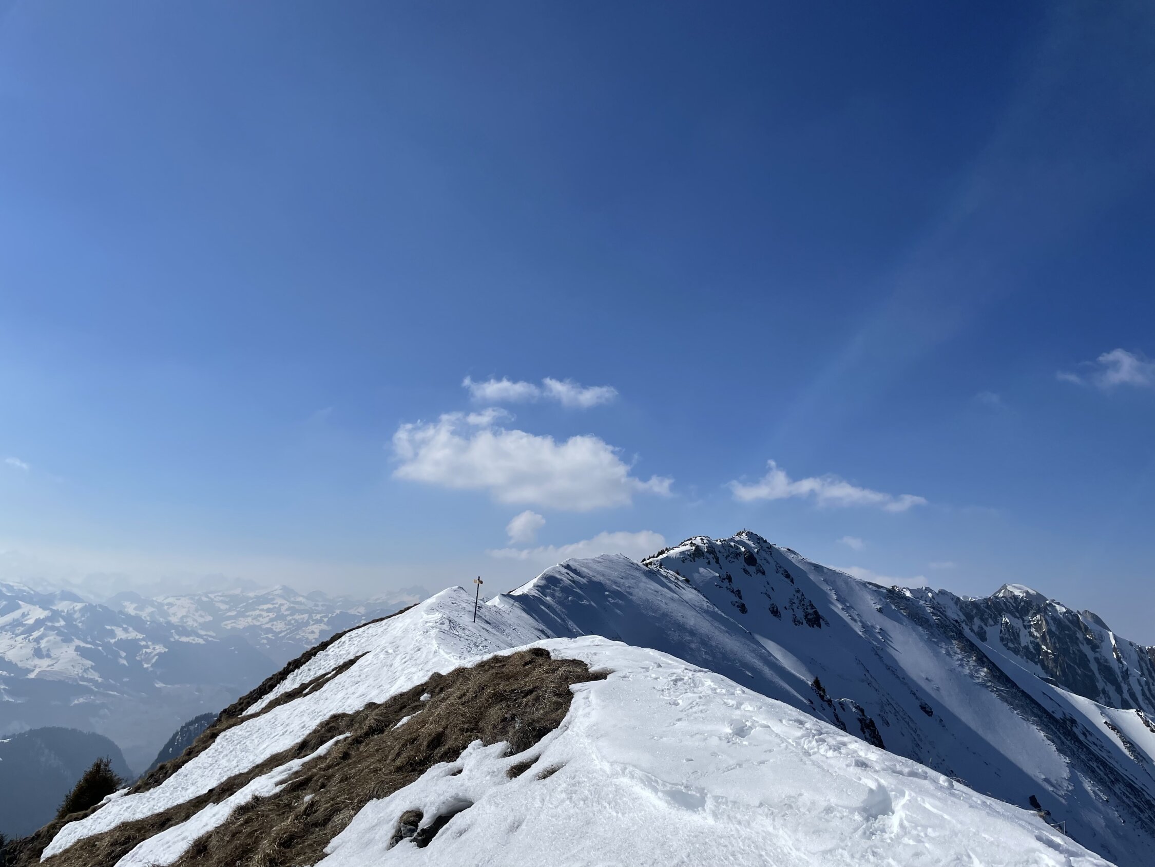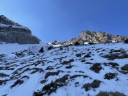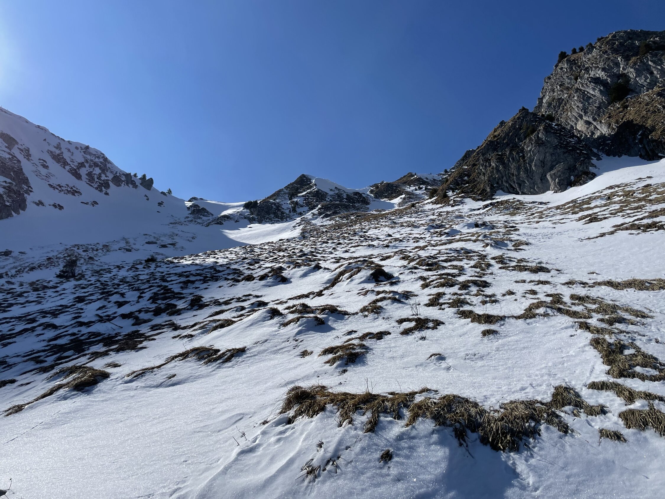 Mit dem Velo bis 1250 m, unterhalb immer mal wieder dünne Schneeauflage, aber nicht schlimm vereist, da nur wenige Fahrzeugspuren. PKW-Spuren bis 1150 m, dann umgekehrt, wohl weil die Bergseite mehr Schnee hat als die Talseite. Ab 1250 m mit Skis bis kurz unterhalb des Sattels, es hat sehr wenig Schnee im Gebiet (letztes Jahr in der zweiten Aprilhälfte hatte es mehr), bis weit rauf auf Gras/Schneegemisch nach oben. Skis ca. 30 m unterhalb Sattel gelassen und zu Fuss den steilen Ausstieg gemacht, ordentlich Tritte mit den Skischuhen gehauen (es hat nur eine dünne Schneeauflage auf einer Hartschneeschicht), Steigeisen und Pickel wären sonst noch komfortabel gewesen. Anschliessend aper auf Wanderweg zum Gipfel.