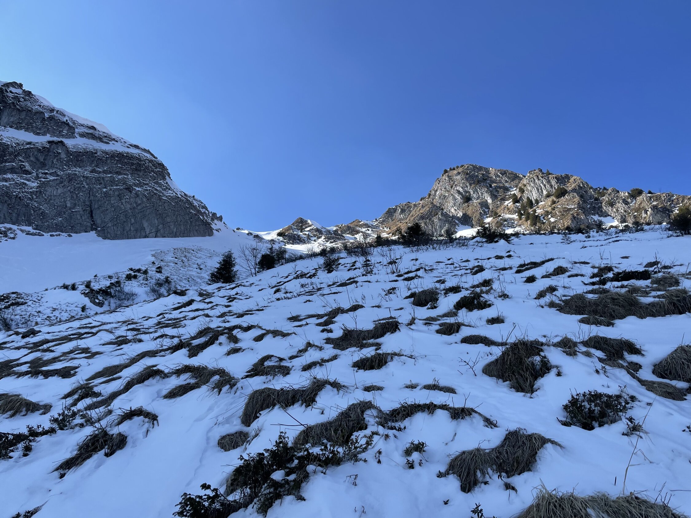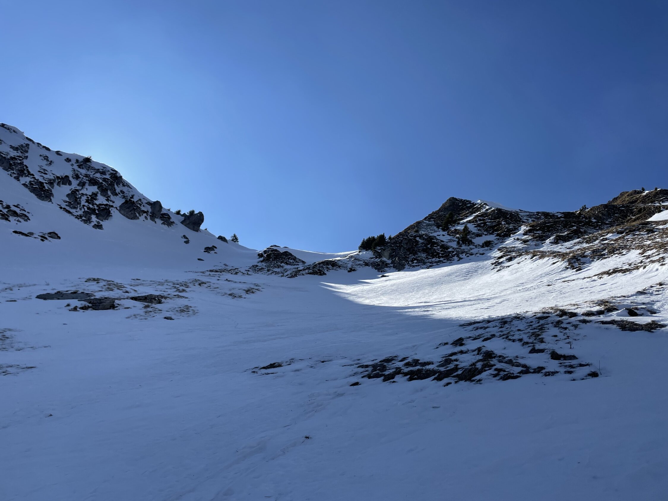 Die Kälte hat den wenigen Schnee bisher konserviert, mit einem Wärmeeinbruch dürfte es unten noch schwieriger werden unten durchzukommen.