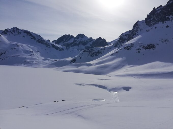 Ab dort dann geschlossene Schneedecke. Anstieg bis zur Talstation der Lünerseebahn fein zu gehen bevor es dann nach der Lünerseebahn hinauf geht in den "Bösen Tritt". Hier benötigt man Harscheisen. Da wo es richtig steil wird haben die meisten die Skier geschultert. Die Strecke am Lünersee entlang alles noch sehr gut eingeschneit. In guter Spur hinauf zur Totalphütte und dann zur Schesaplana. Hier auch nochmals ein Teilstück das mit Harscheisen besser zu gehen ist. Die typische Wächte die es immer gibt vor dem letzten kurzen Gipfelhang ging sehr gut und da waren Harscheisen nicht notwendig.