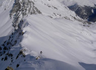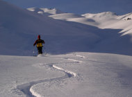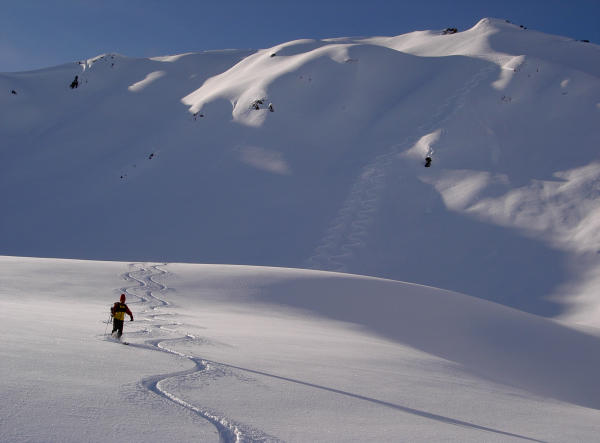 Wunderbarer, gut gesetzter und unverblasener Pulver vom Feinsten. Neuschnee zwischen 30 bis 50 cm. Hänge bereits erstaunlich gut gebunden. Keine Leute unterwegs, da harte Spurarbeit...