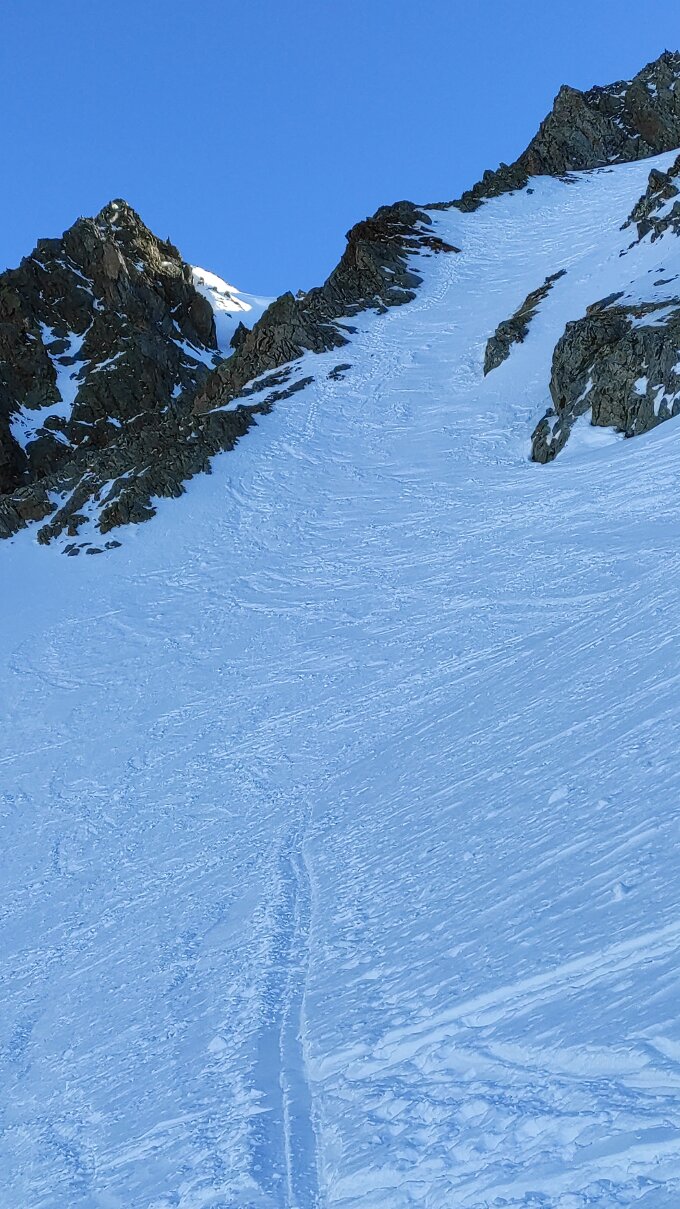 Aufstieg von der Passstrasse bis zum Rossfirn problemlos, ging auch am frühen Morgen noch knapp ohne Harscheisen. Das Couloir hat ein paar sehr harte/eisige Stellen drin, ging jedoch noch ohne Steigeisen. Je nach persönlichen Vorlieben könnten aber Steigeisen den Aufstieg etwas angenehmer machen. Die Gipfelflanke um 11:00 Uhr noch hart, ging aber gut zum fahren. Das Couloir runter in der oberen Hälfte praktisch nur seitwärts gerutscht. Sinnlos, da schön fahren zu wollen, ausser man ist ein Crack. Untere Hälfte ging dann besser. Ab dem Rossfirn dann harter Pulver, nach den schönen Tagen natürlich schon ziemlich ausgefahren, trotzdem machte die Abfahrt dort Spass. Problemlos weiter zurück zur Passstrasse.