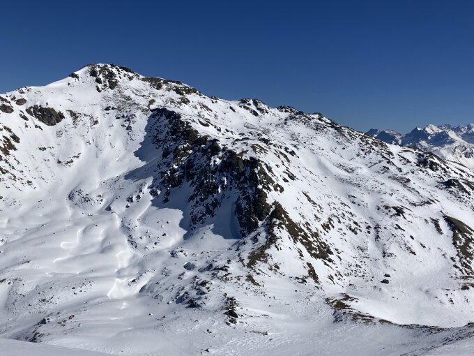 Aufstieg ab Fuorcla Sassalba sah aus wie eine Geröllhalde, so dass wir auf den besser eingeschneiten Muntet auswichen.