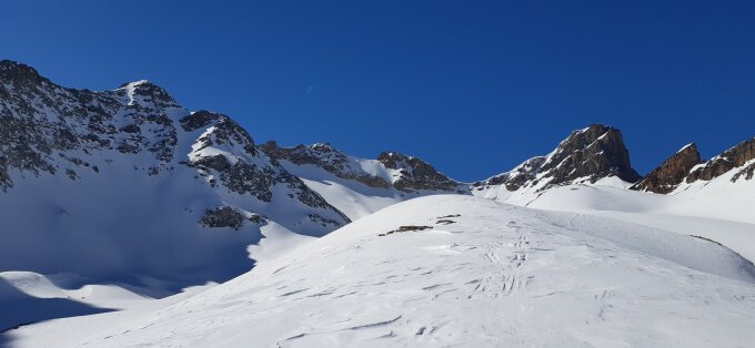 Vom Hockenhorngrat bis Lötschenpass harte Ratracspur, dann bis unders Färda hart/pistenähnlich/verblasen. Im Aufstieg mehrere Möglichkeiten, wir haben eine mittlere in der Sonne gewählt.