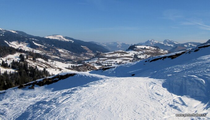 Abfahrt: In Schattenhängen pulverig, wenn auch meist verfahren, gut zu fahren. Dann auch ruppiger, wo die Sonne den Schnee schon aufgetaut hat und es nun härter ist. Auf der Waldstrasse recht unruhig. Breite Piste, jedoch viele Dellen von den Schneeschuhläufern.