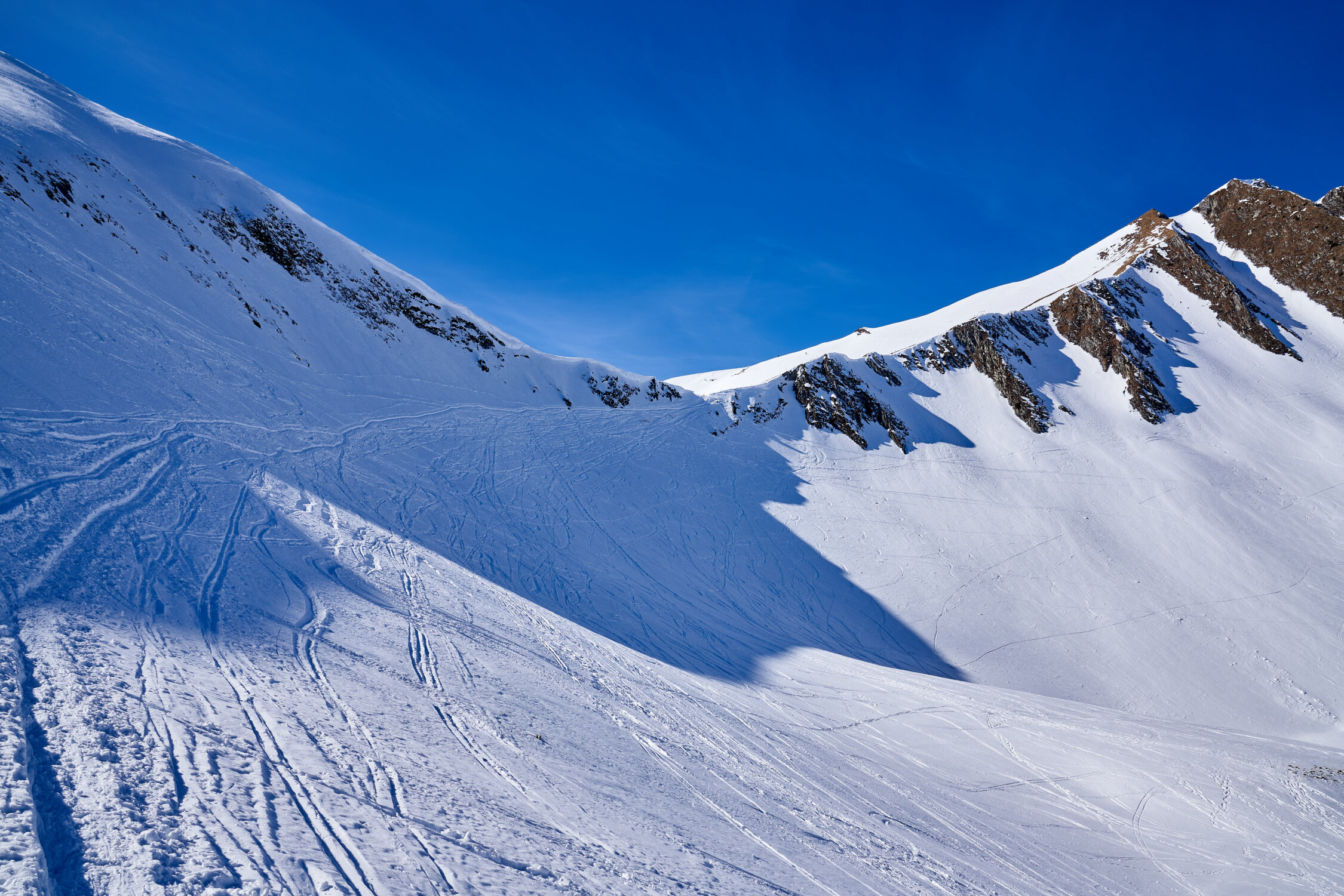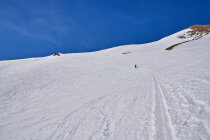 Am Morgen um 10 Uhr -5°C und ein kühler Wind am Start. Die Tour ist durchgehend mit Schii begeh- und befahrbar. Durchgehend gute Spuranlage. Vielen Dank an die Schaufler für die gute Spuranlage am Morgetenpass.Ab dem Umrunden des Südgrates wird es sehr mager mit der Schneeauflage. Etliche grasige Flecken sind zu queren. Kurz vor dem Gipfel gibts keine durchgehende Schneeauflage mehr.