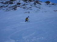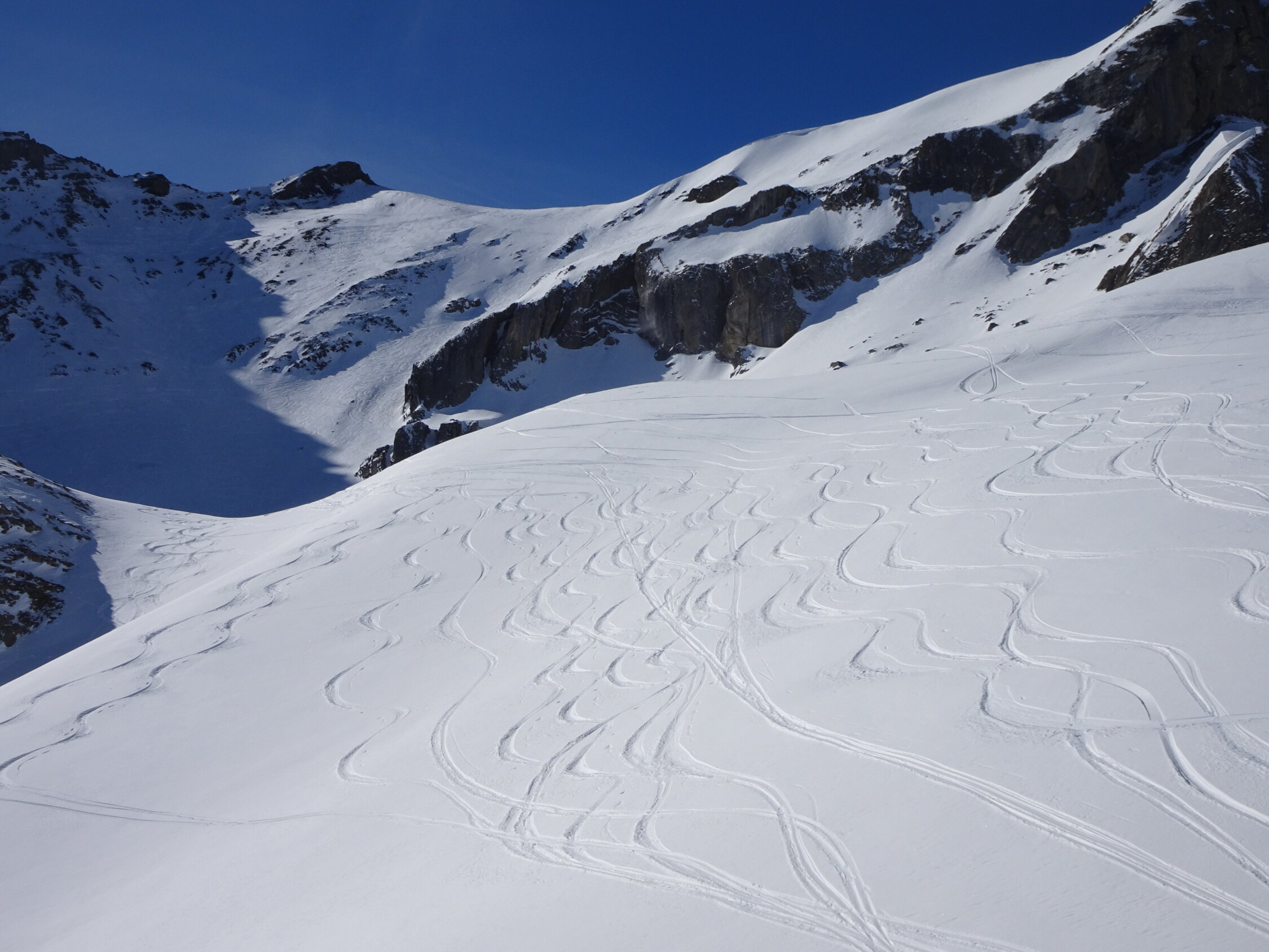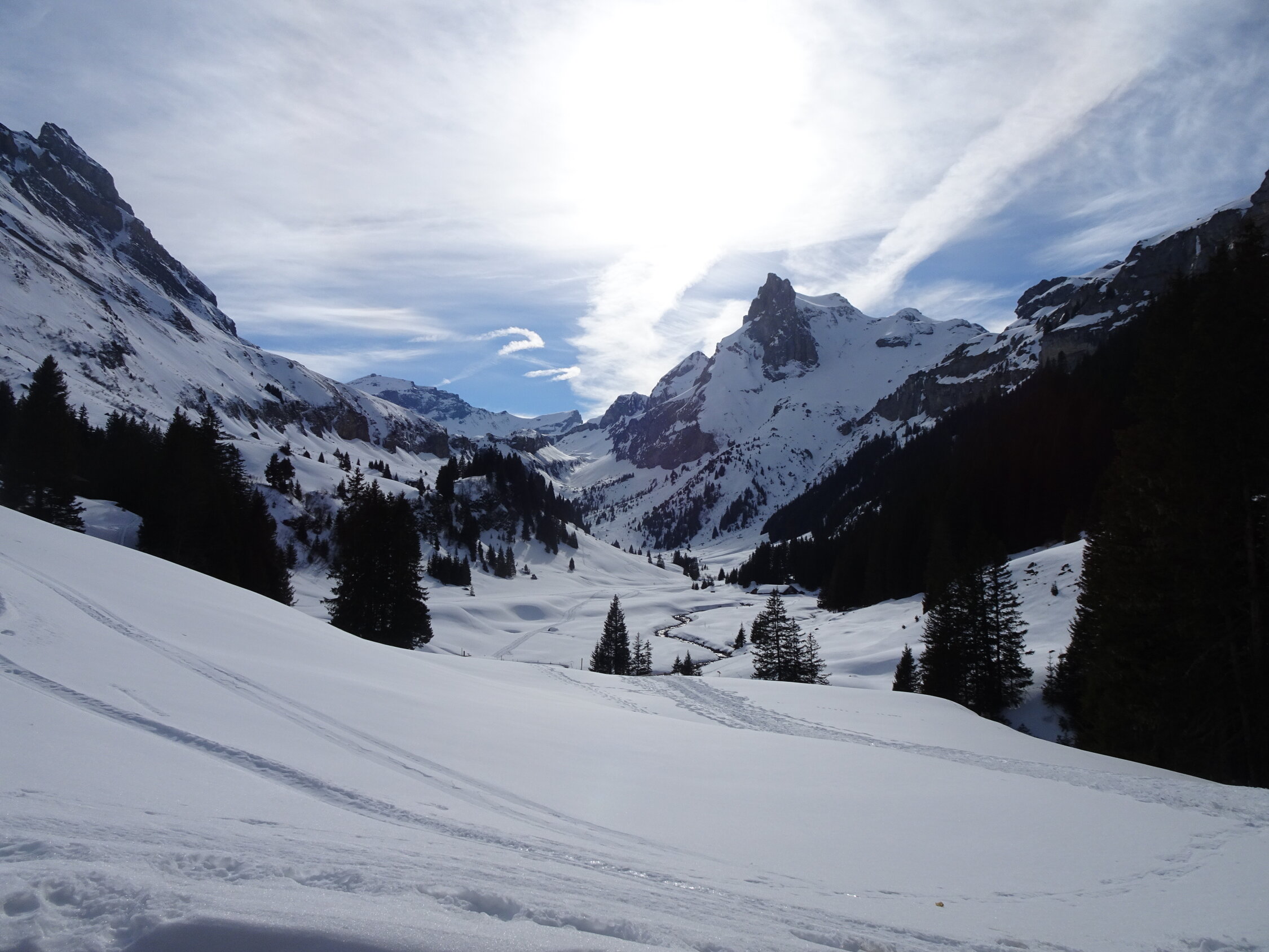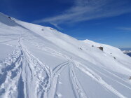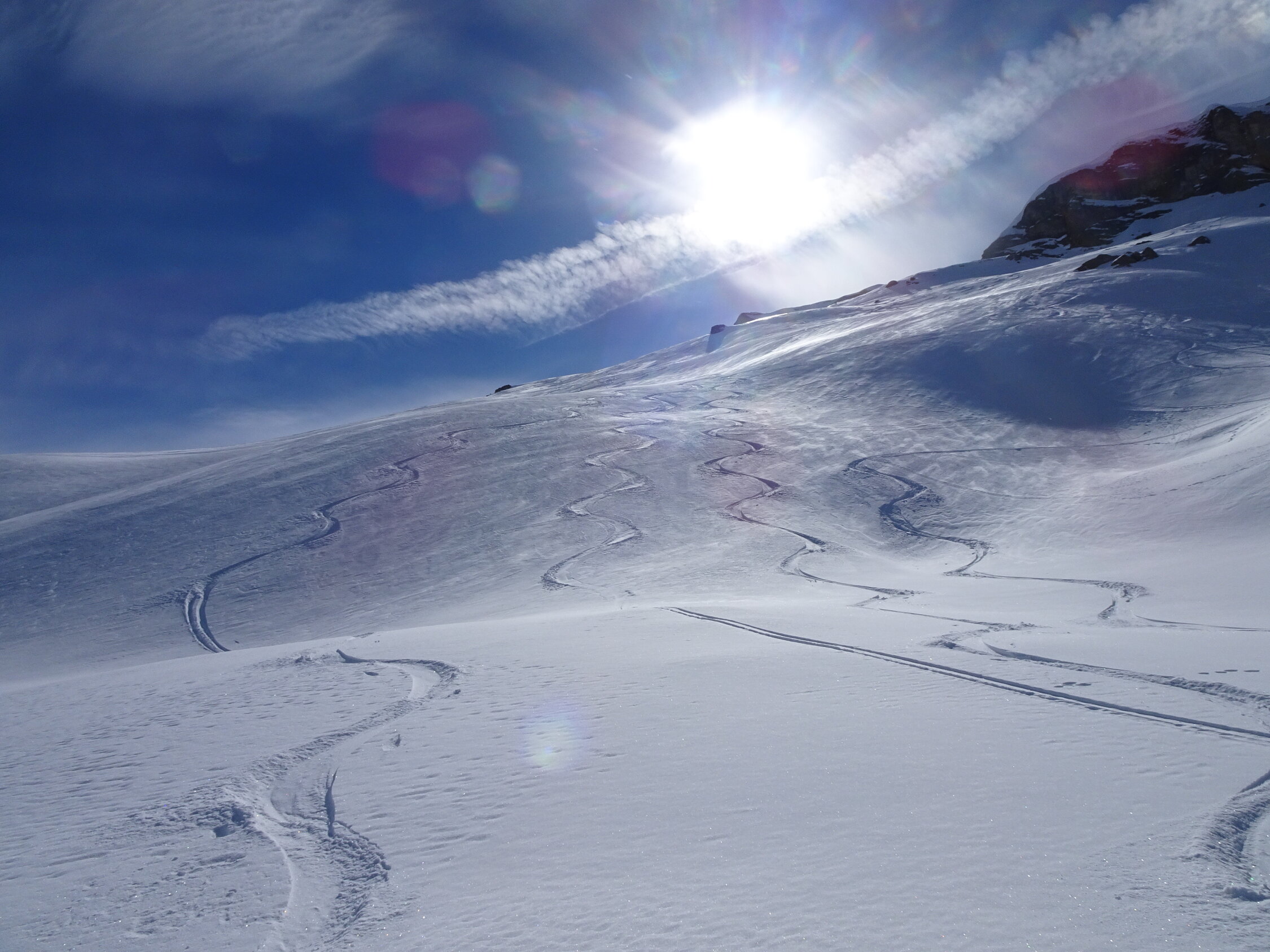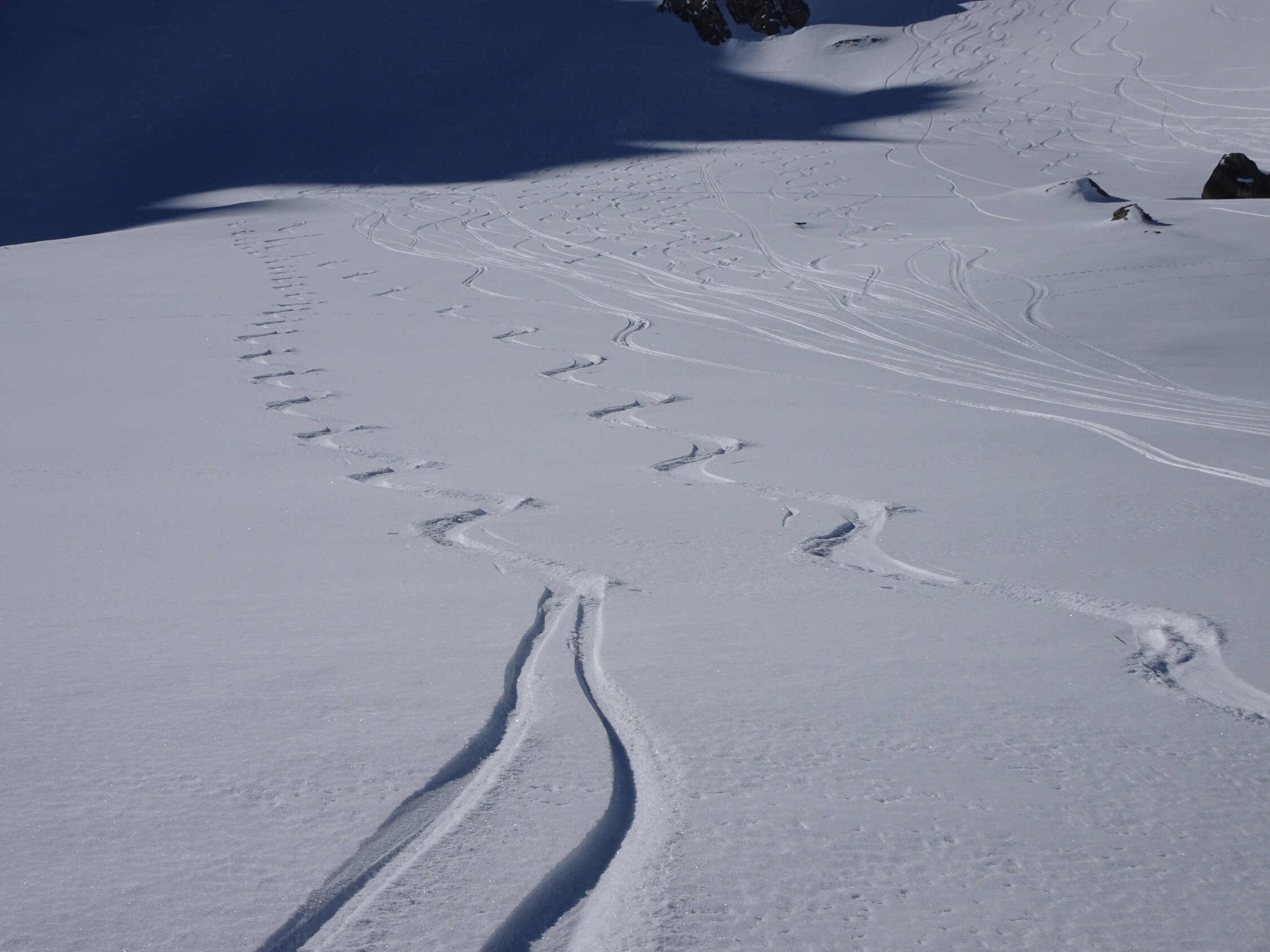 Schnee: erste Abfahrt bis unter Schafläger Pulver, zweite Abfahrt bis in die Ebene von Hogant ebenfalls Pulver, danach bis Sousläger relativ ruppig, der Rest auf den Strässchen Sulz mit drei kurzen Tragstrecken