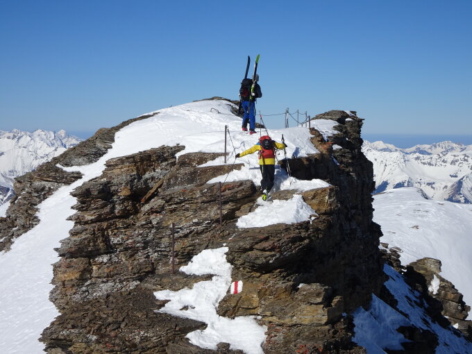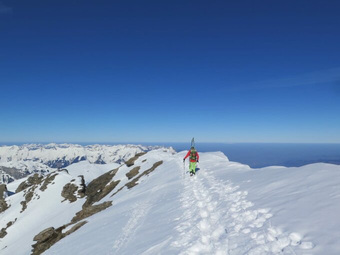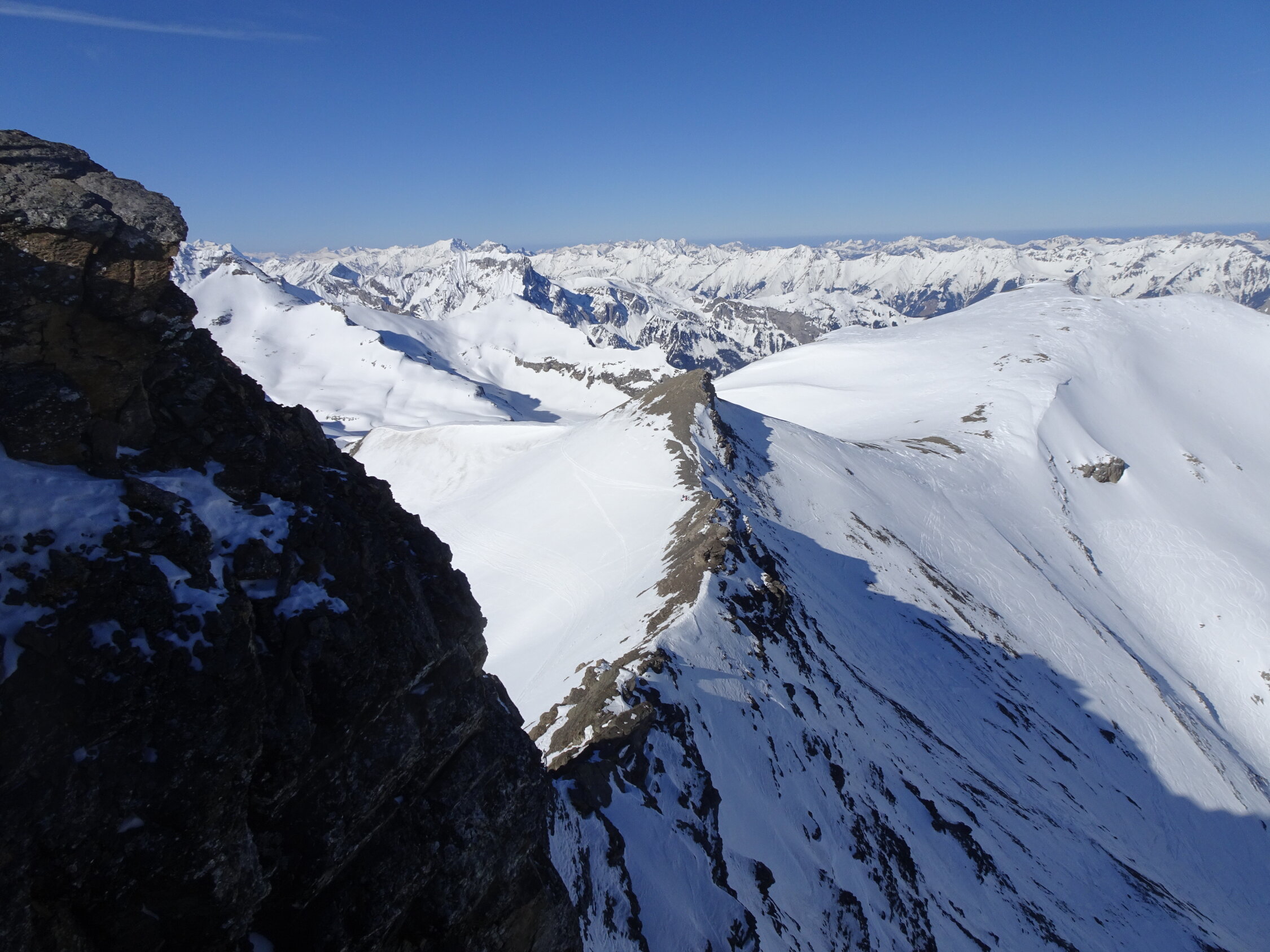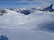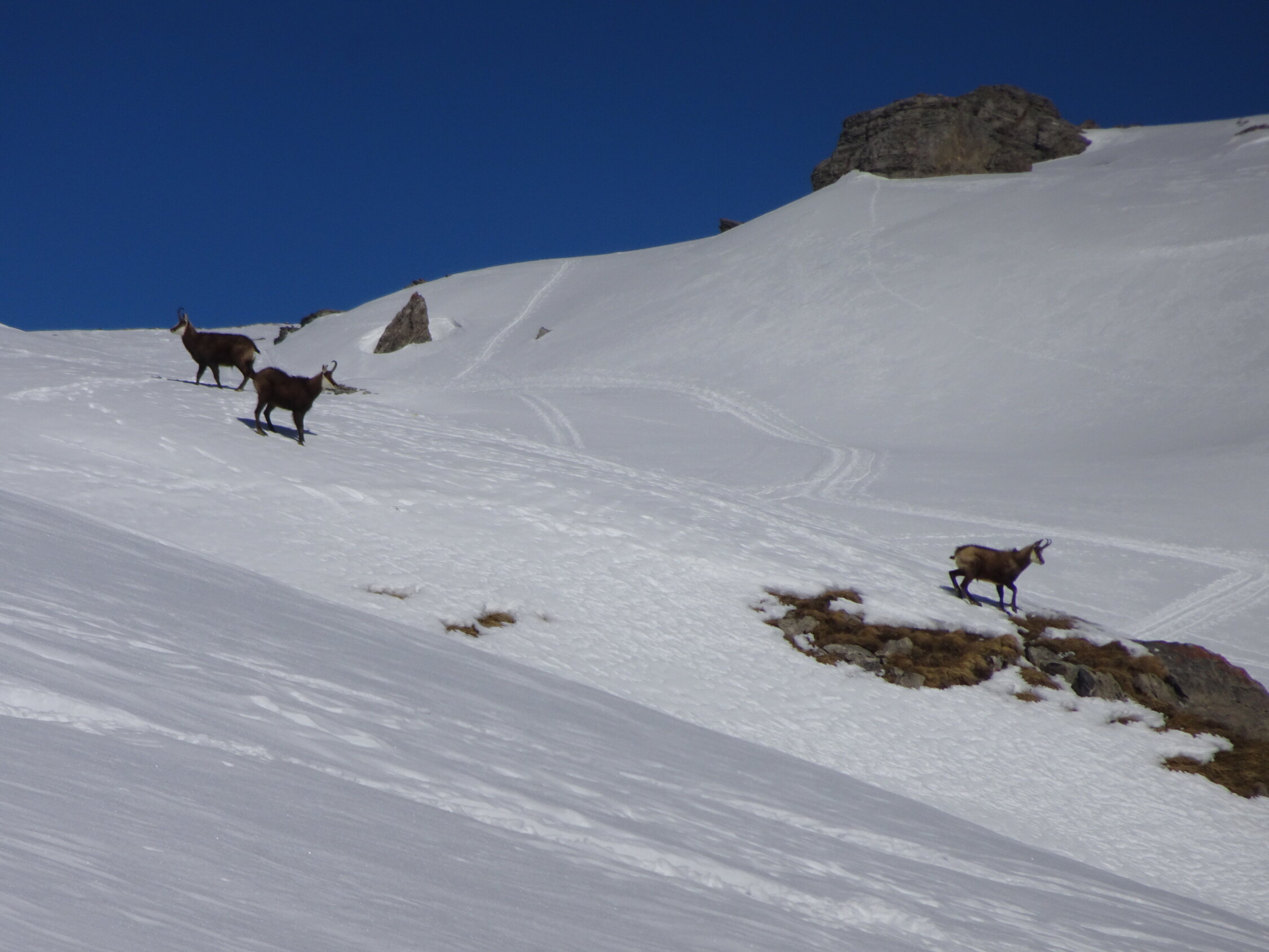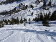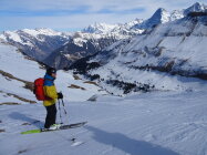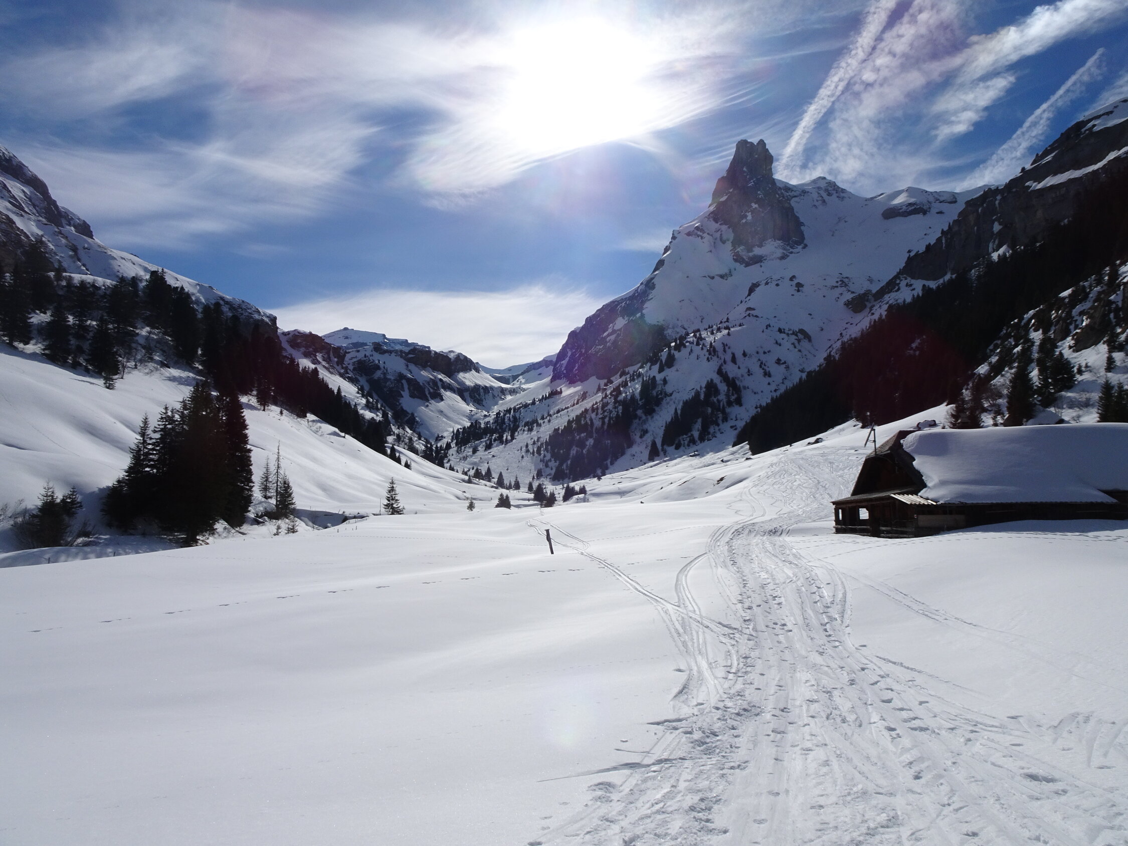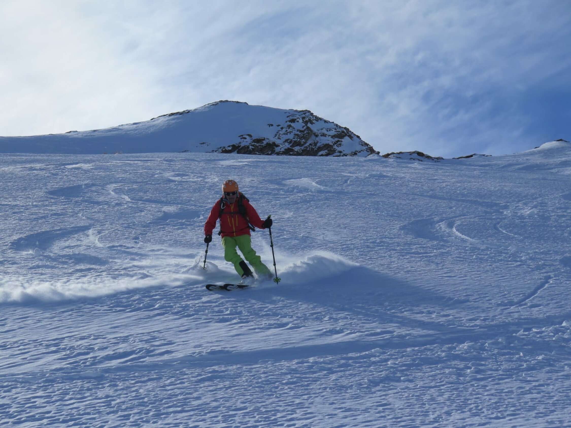 Schnee: erste Abfahrt bis unter Schafläger Pulver, zweite Abfahrt bis in die Ebene von Hogant ebenfalls Pulver, danach bis Sousläger relativ ruppig, der Rest auf den Strässchen Sulz mit drei kurzen Tragstrecken
