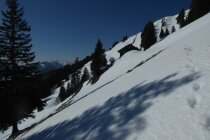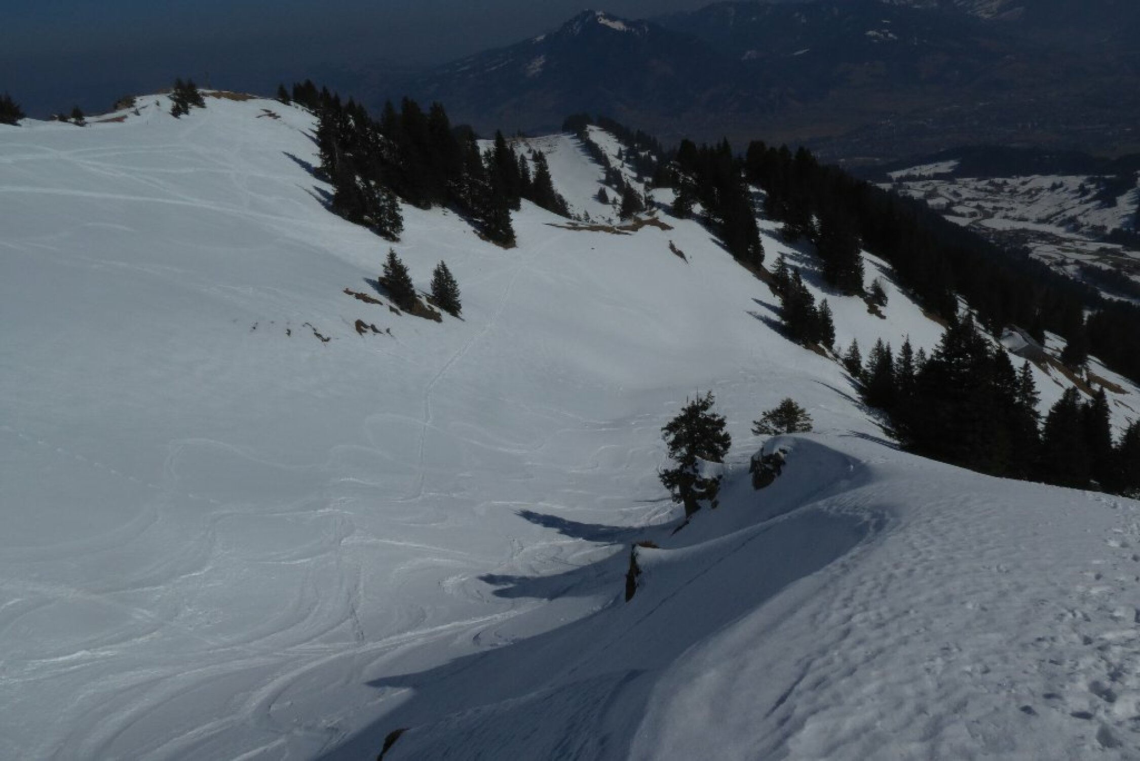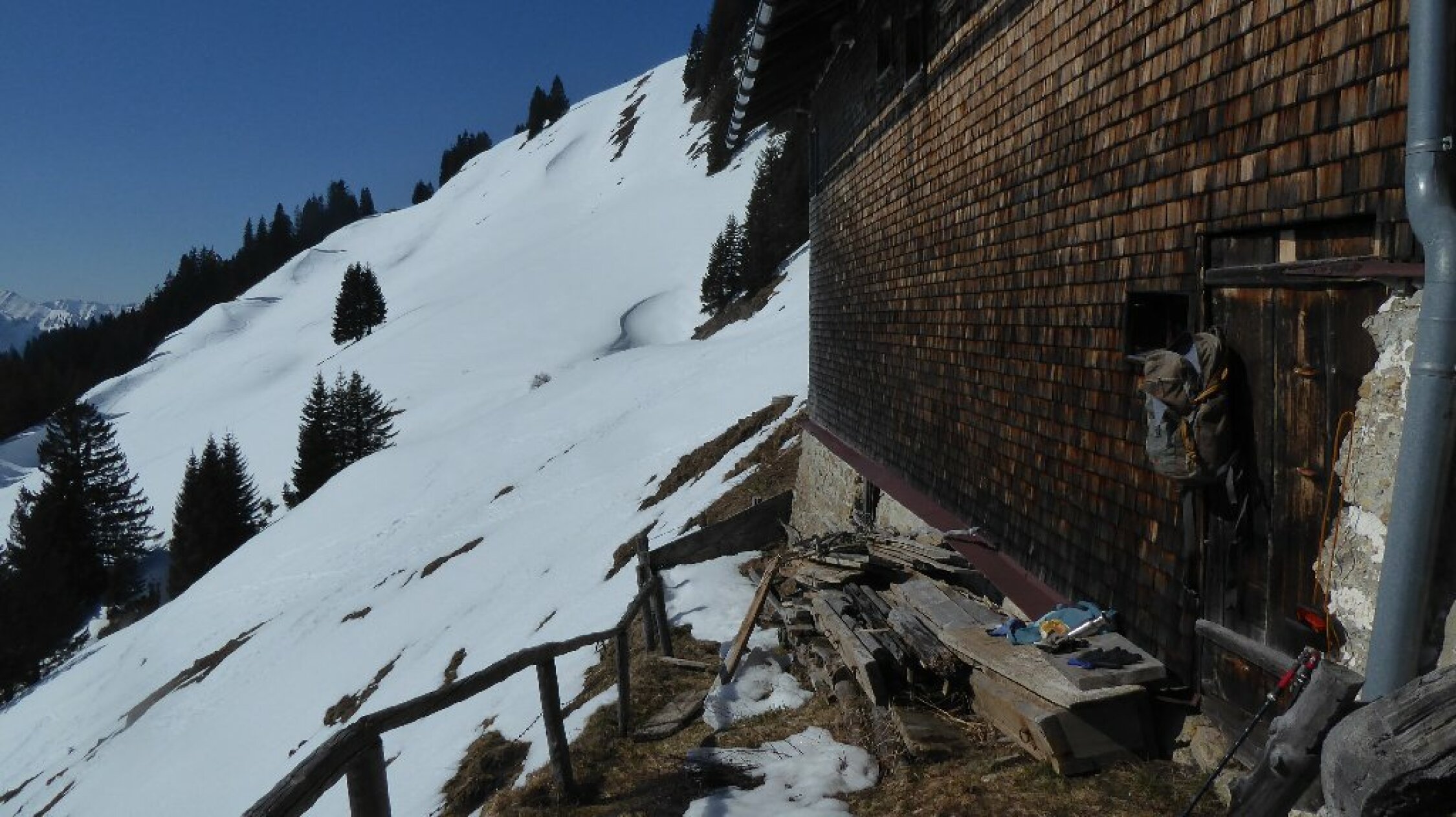Wetter grandios, heute mal wieder wärmer. Alles bestens eingespurt und tragend auf alter Spur über Viehtrieb zur Grathöfle/Steinerberg Alpe(von einem Gebietskenner). Frei nach dem Motte entweder mit Ski oder richtig zu Fuss. Heute letzteres optimal. Start an Säge nach Winkelwiesen zur Dürrrehornalpe, weiter wie oben unter Route. Abstieg wie Aufstieg.(Mit Ski von Süd keine Option mehr).