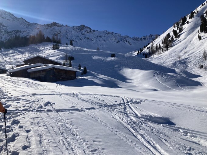 Gipfelhang zwar fast komplett verspurt, allerdings weil aufgrund der Exposition so lockerer Pulverschnee liegt, geht das noch immer sehr gleitig beim Hinunterfahren.