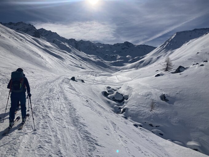 Toller Pulver durchs Gletschtälli hinab! Allerdings an wenigen Stellen etwas ver- bzw. abgeblasen. Leider 1 grober Steinkontakt auf ca. 2'600m snif )-: da war etwas Pech dabei. Sonst durchgehend gute Schneeverhältnisse.