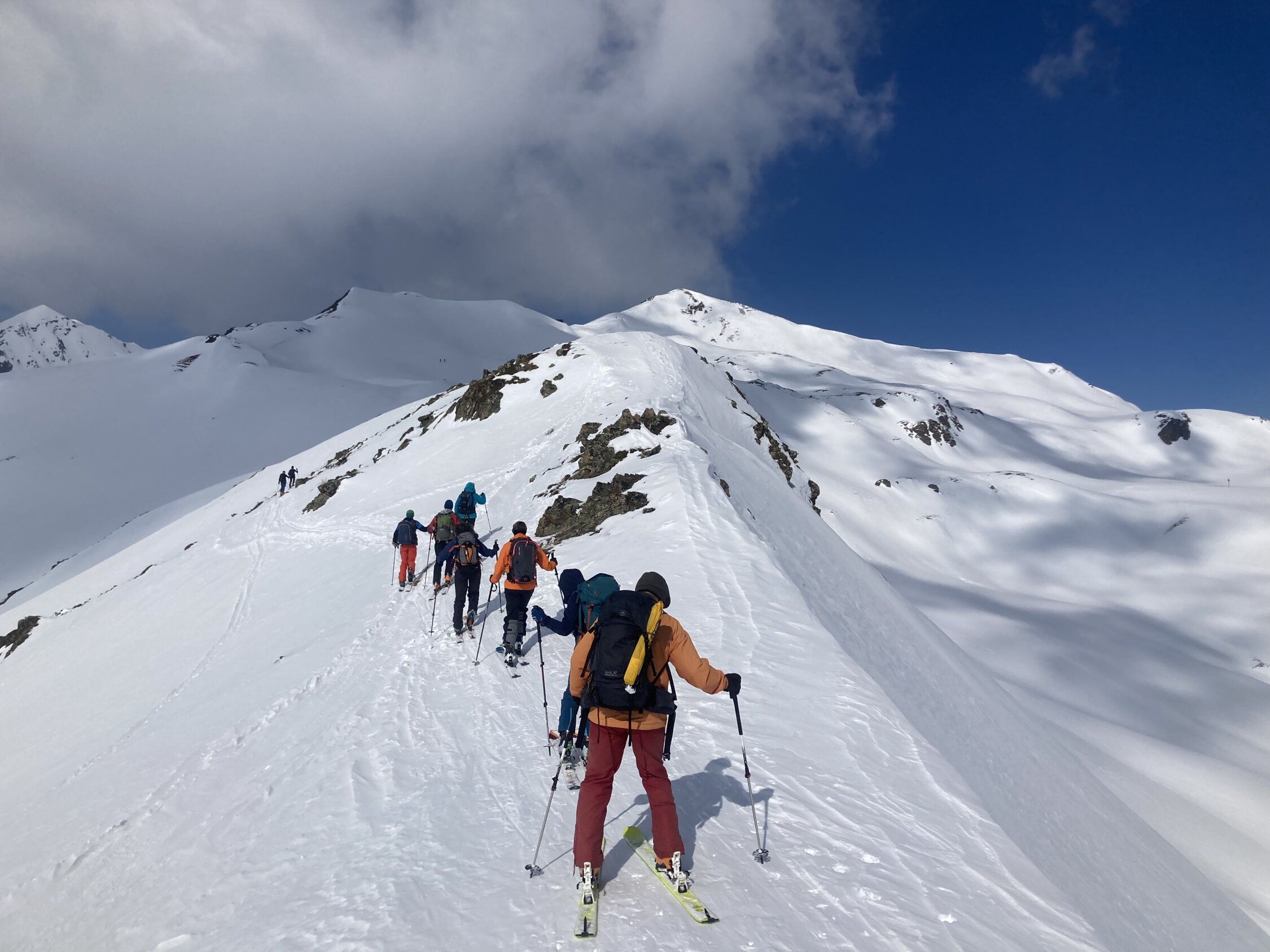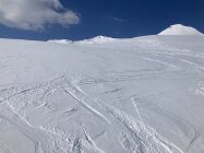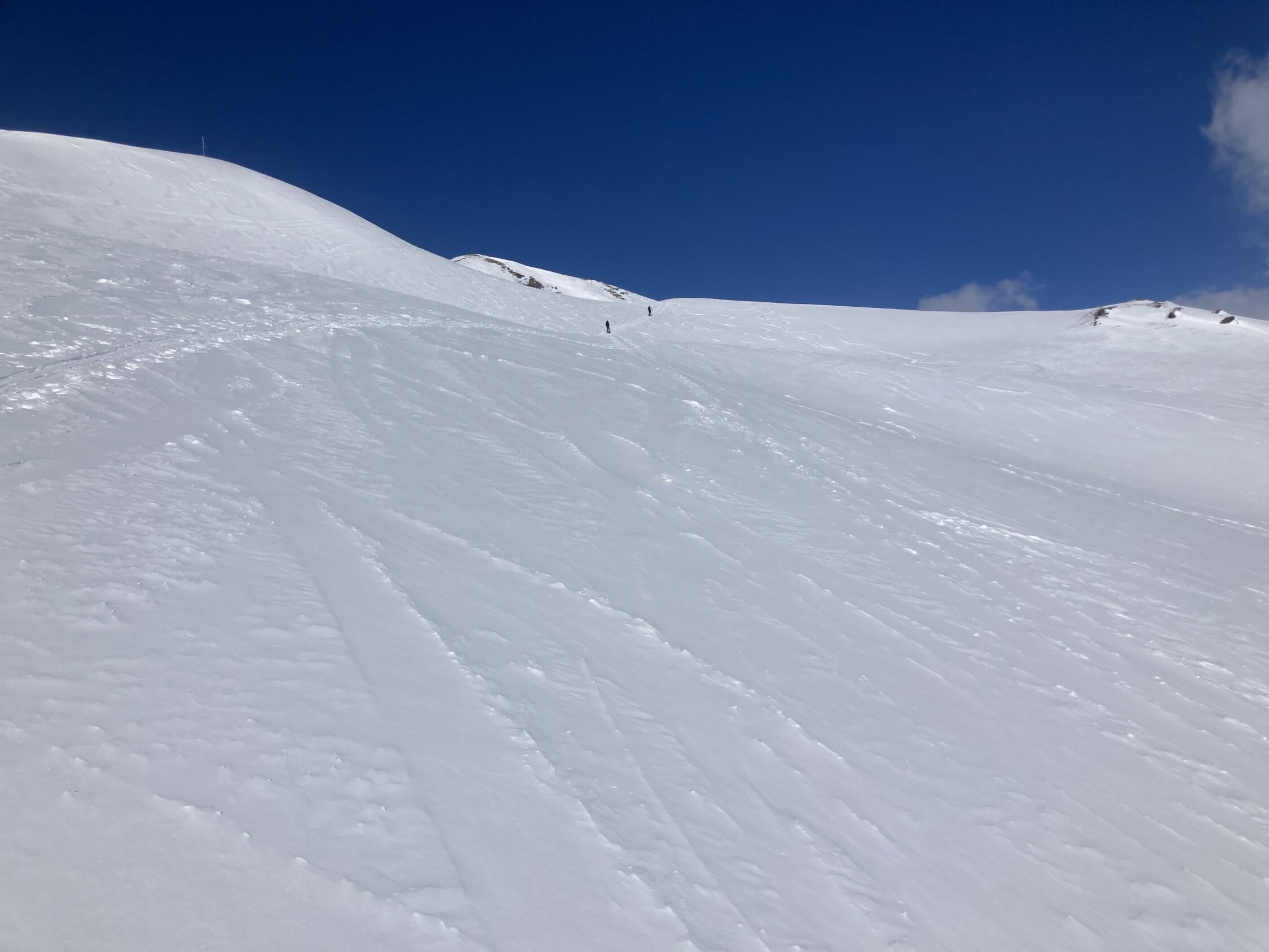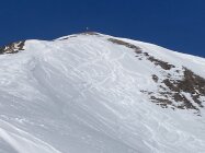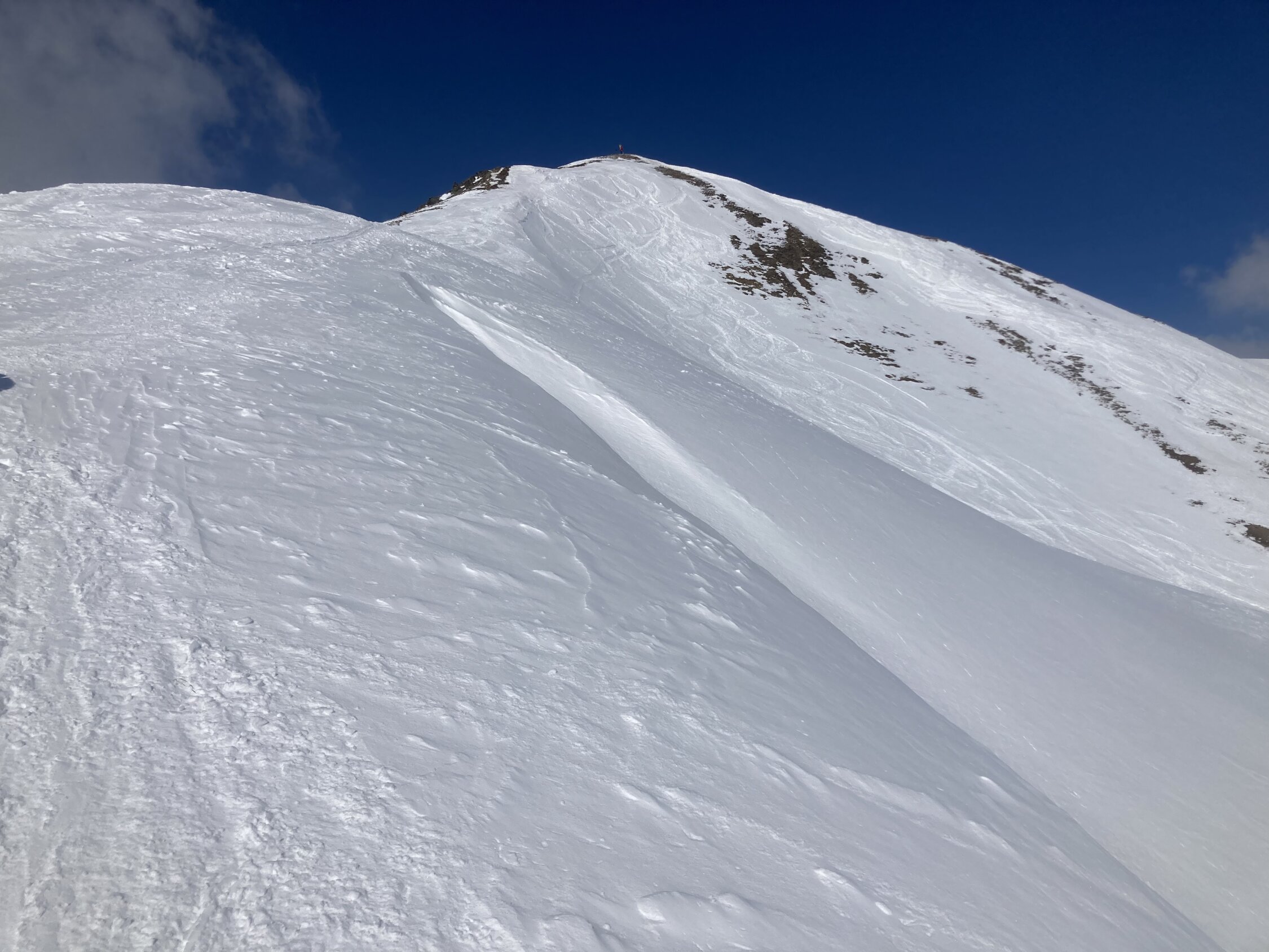 Viel Wind an diesem Tag, dadurch etwas Deckel/Bruchharst im obersten Teil. Grat/Gipfel stellenweise aper wegen der Sonne und dem weggeblasenen Schnee - es empfiehlt sich ein Skidepot für die letzten Meter (oder westlich "ausholen", wer mit den Skis auf den Gipfel will).