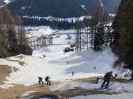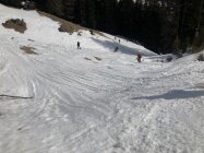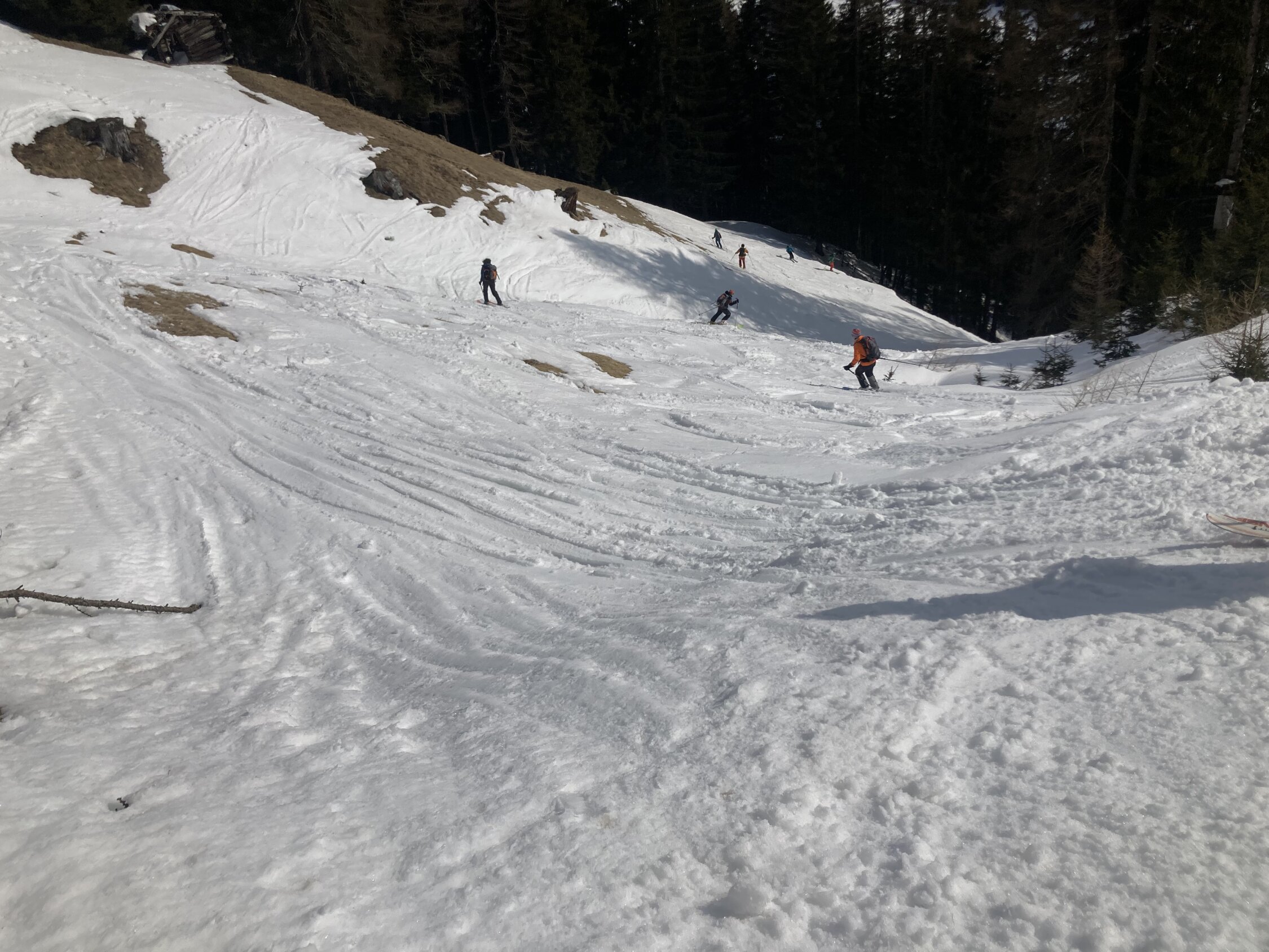 Ab zirka 2'450m abwärts toller Sulzschnee! Je weiter herunter man kommt, desto dicker wird der Sulz. Unterhalb 1'800m ist es dann eher Nass-Schnee bzw. hat's keinen Schnee mehr (siehe Fotos). Skis beim Waldausgang ca. 20 Meter getragen, dann ging's wieder durchgehend mit Schnee bis zur Landwasserstrasse.