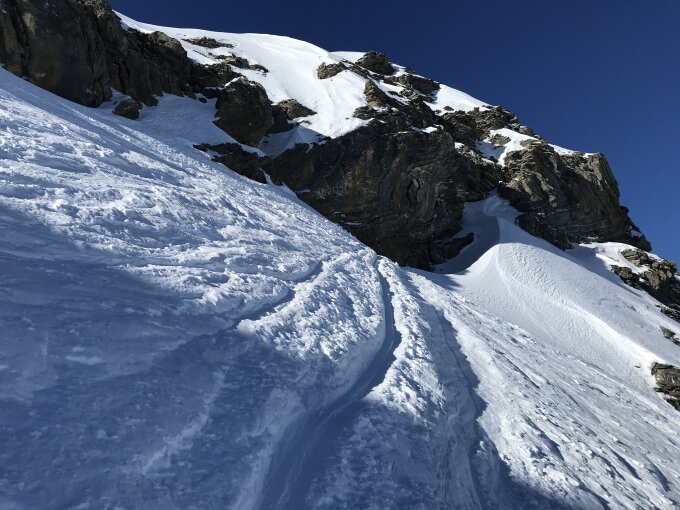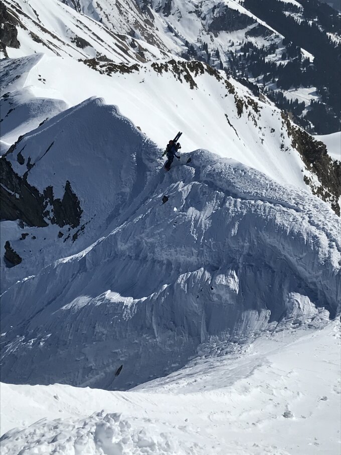 Die Schlüsselstelle (die letzten Meter auf den Grat) ist gut gespurt. Nach einer kurzen Tragepassage können die Skier wieder angeschnallt werden. Wenn jemand unsicher ist kann ein Pickel oder die Steigeisen hilfreich sein.