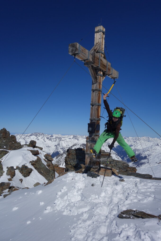 Start 8:00 ab Jammtalhütte auf guter Spur, ab 2800 braucht es Harscheisen. Ab 3100m sind wir auf steigeisen gewechselt. Auf 3250m nach der Weilmannrinne Skidepot. Eine kurze Stelle II etwas brüchig, sonst perfekte Tritte. Um 12:30 mit Pausen am Gipfel - Windstill, einfach perfekt. Um 13:30 Abfahrt durch das Couloir, Harschdeckel war dann weich genug , mit dem Board perfekt zu fahren. Zurück über Furtschöl pass und Val Tasna (hat noch viel Schnee!) um 17:00 Dank Taxi wieder in Scuol.