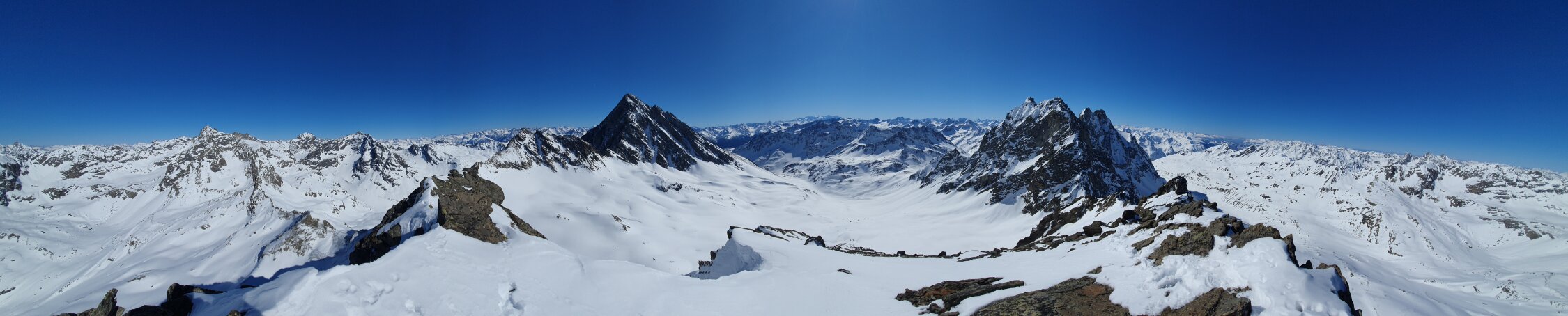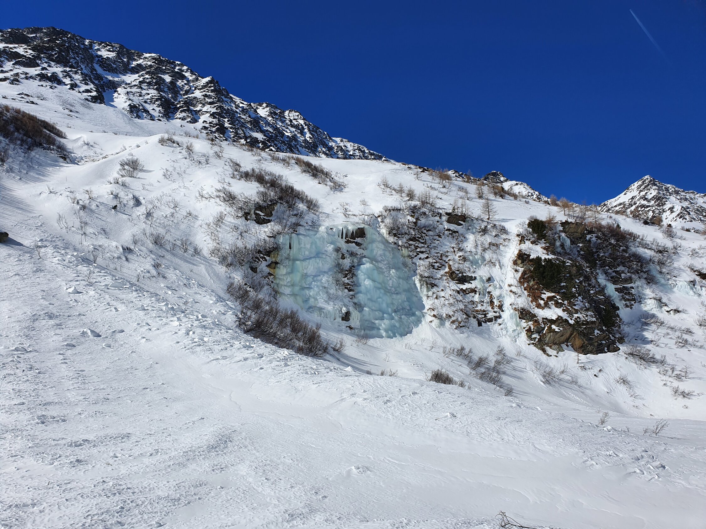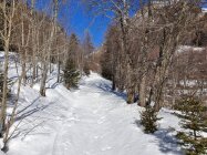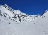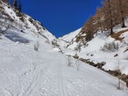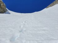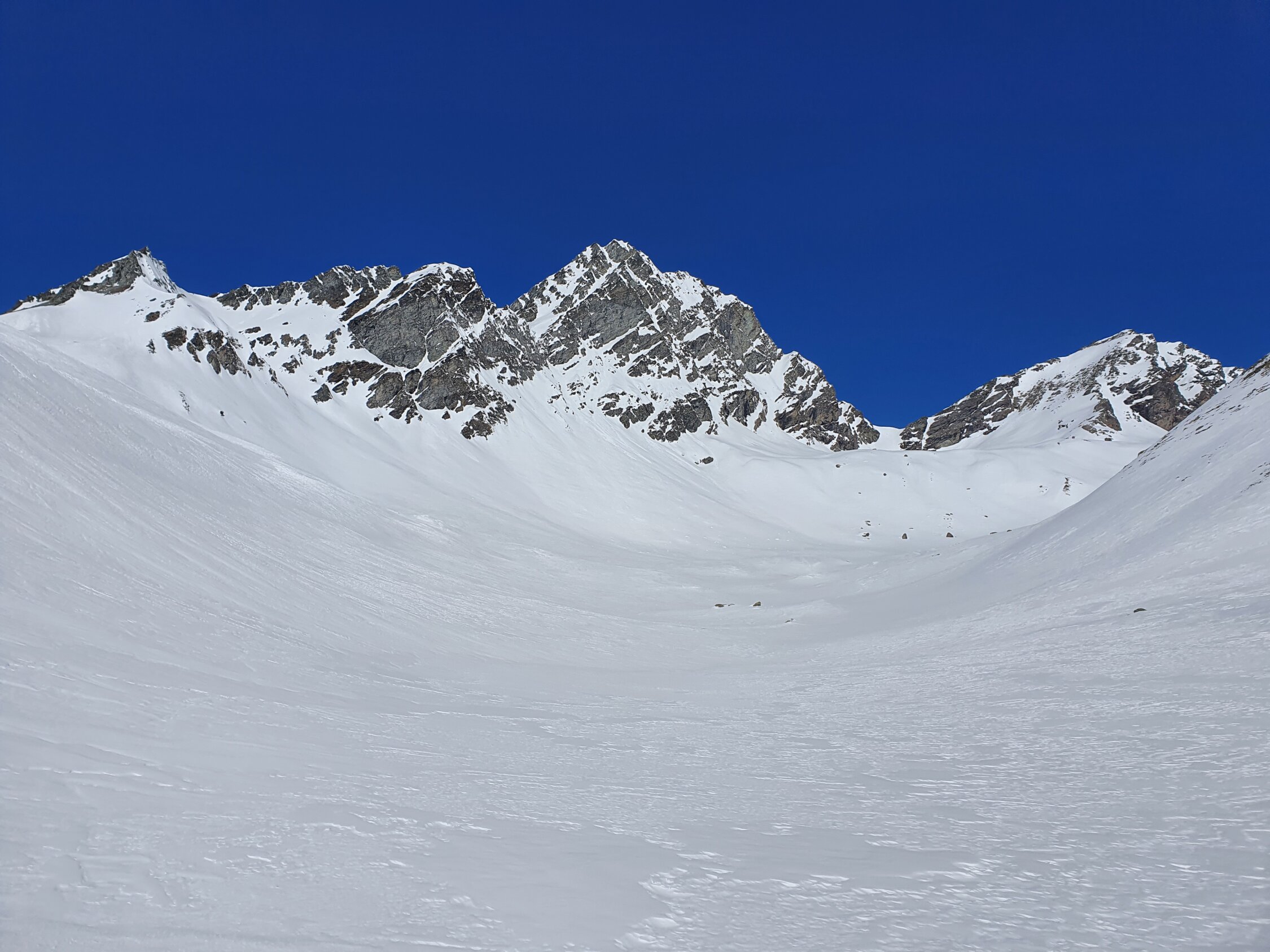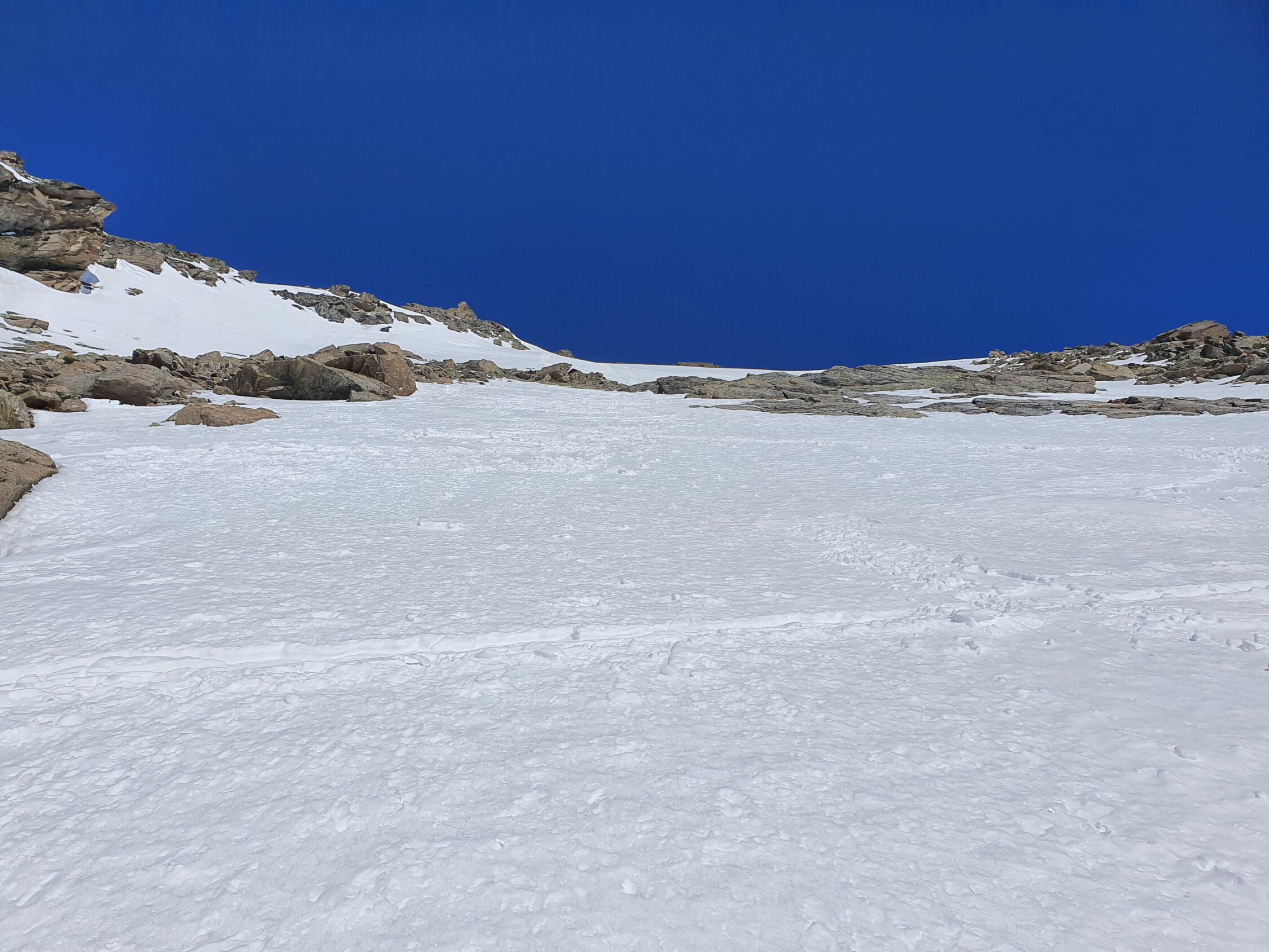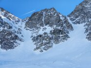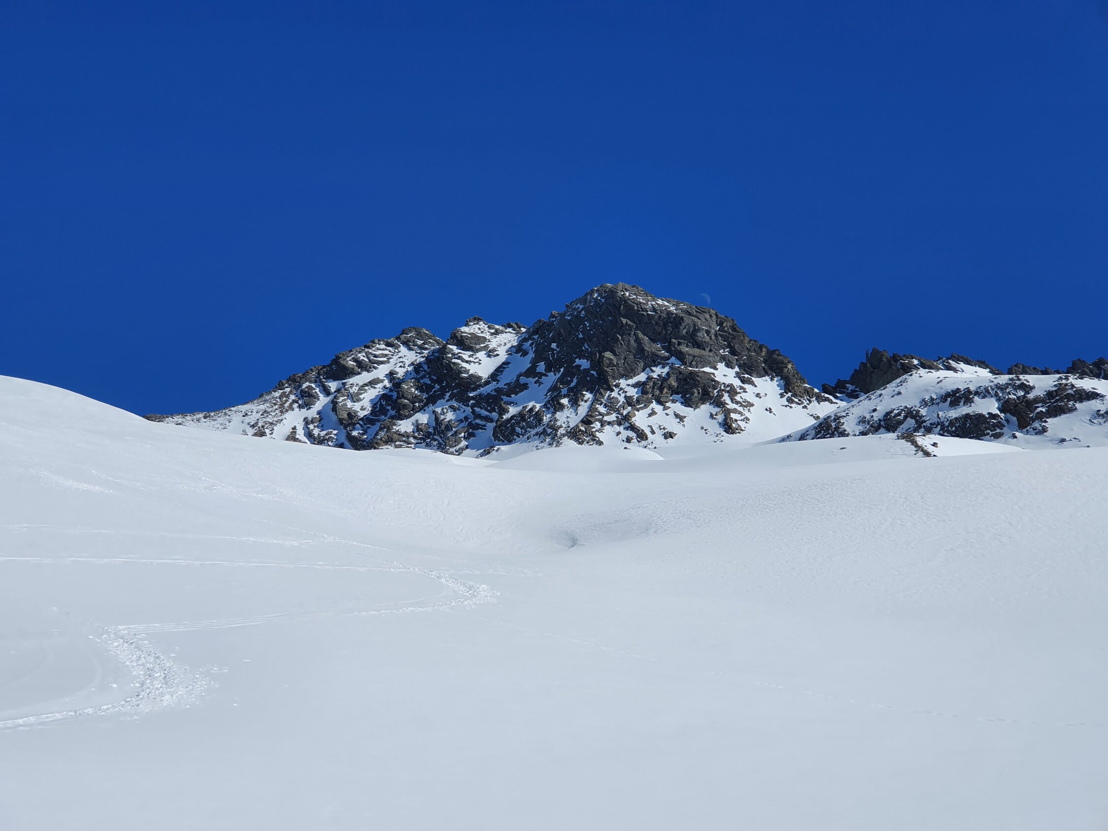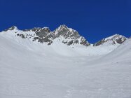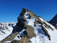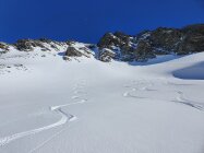 Ich bin mit den Skis direkt hoch (bis 40° auf 250Hm) zum Piz Zadrell. Hier ist eine sichere und einwandfreie Skitechnik erforderlich! Alternativ kann man die Skis am Rucksack anbinden und direkt hochsteigen. Da der Hang südlich ist, ist der Schnee da meist schon sulzig und auch ohne Steigeisen problemlos machbar. Es lohnt sich die Skis bis zum Skidepot bei ca. P3080 hochzutragen. Ab hier ist der Gipfel in wenigen Metern unschwierig zu erreichen.
