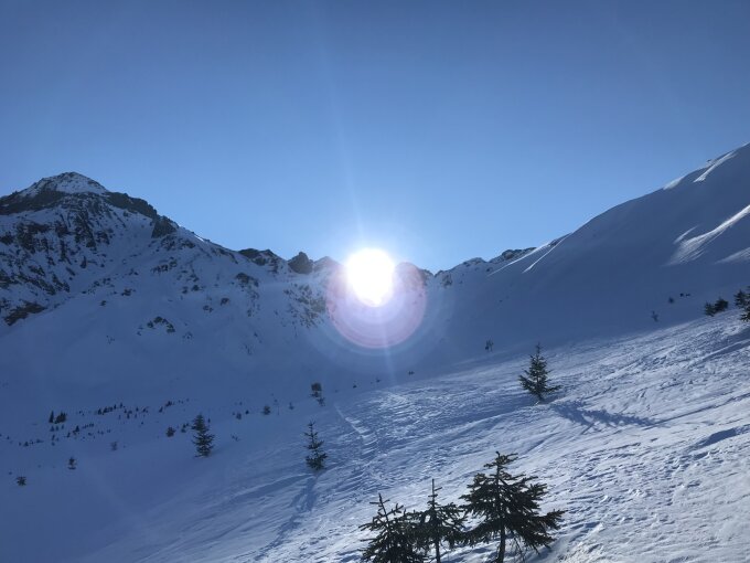 Abfahrt halt wie erwartet im windbearbeitetem Presspulver, vereinzelt noch richtig schöne Stellen.