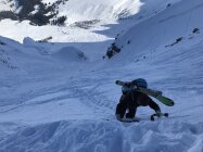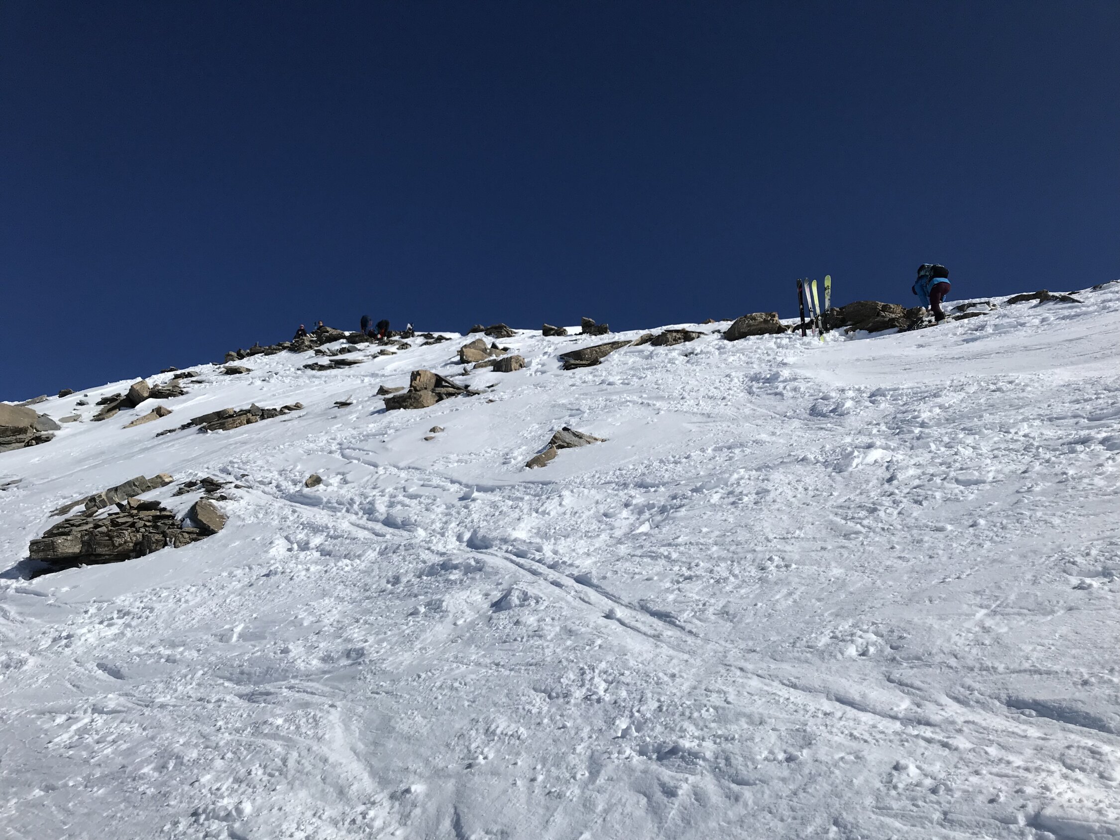 Problemloser Aufstieg auch im Steinbodenhang, nur kurz unter der Wächte wenige Meter zu Fuß.