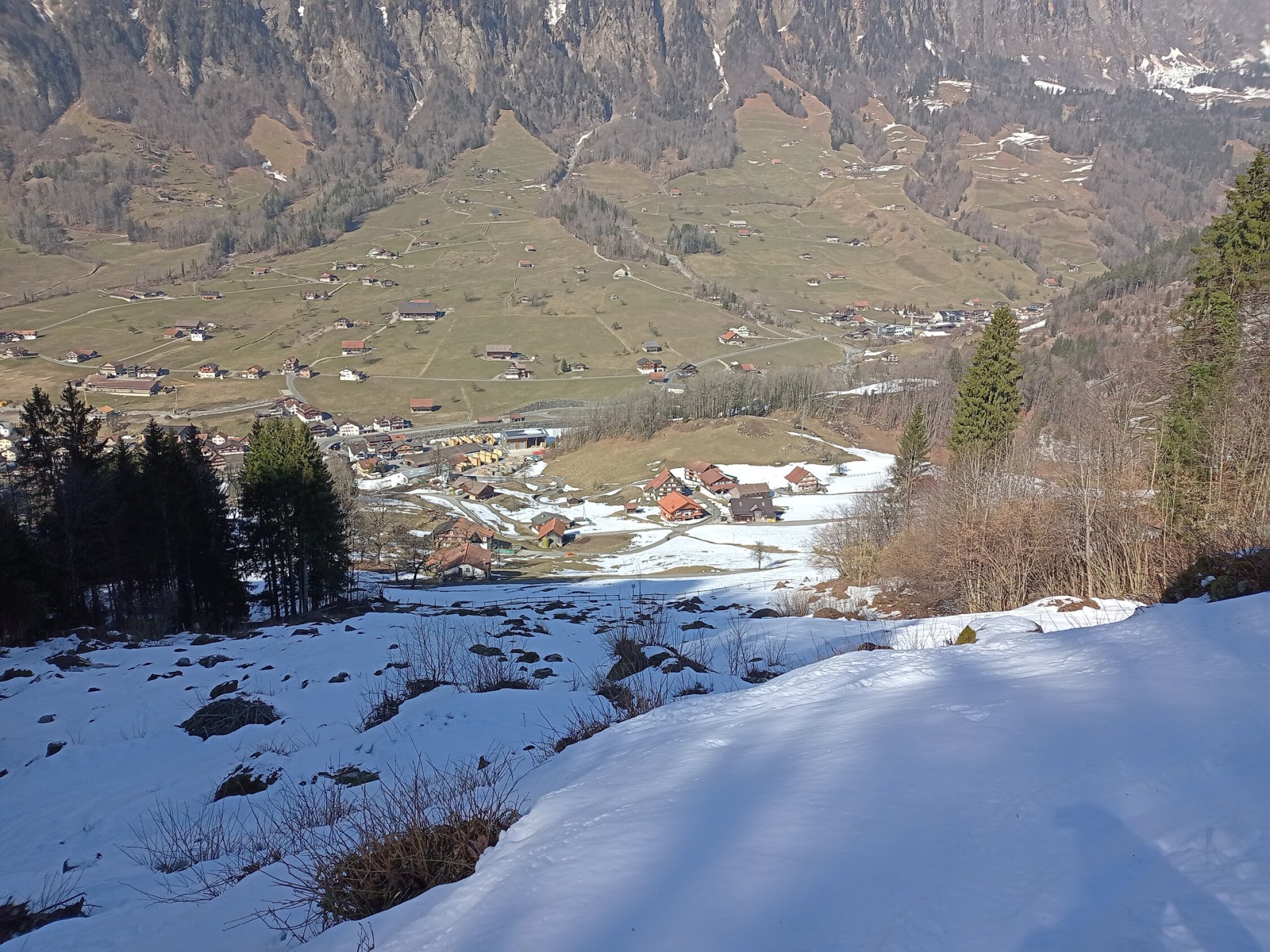 Die Stöckelpartien gingen heute noch recht gut und es hatte nur wenig Bremsschnee. Abfahrt noch auf guter Schneeunterlage bis auf 665. in 10 Minuten Fussmarsch zur Haltestelle Muotathal, hintere Brücke.