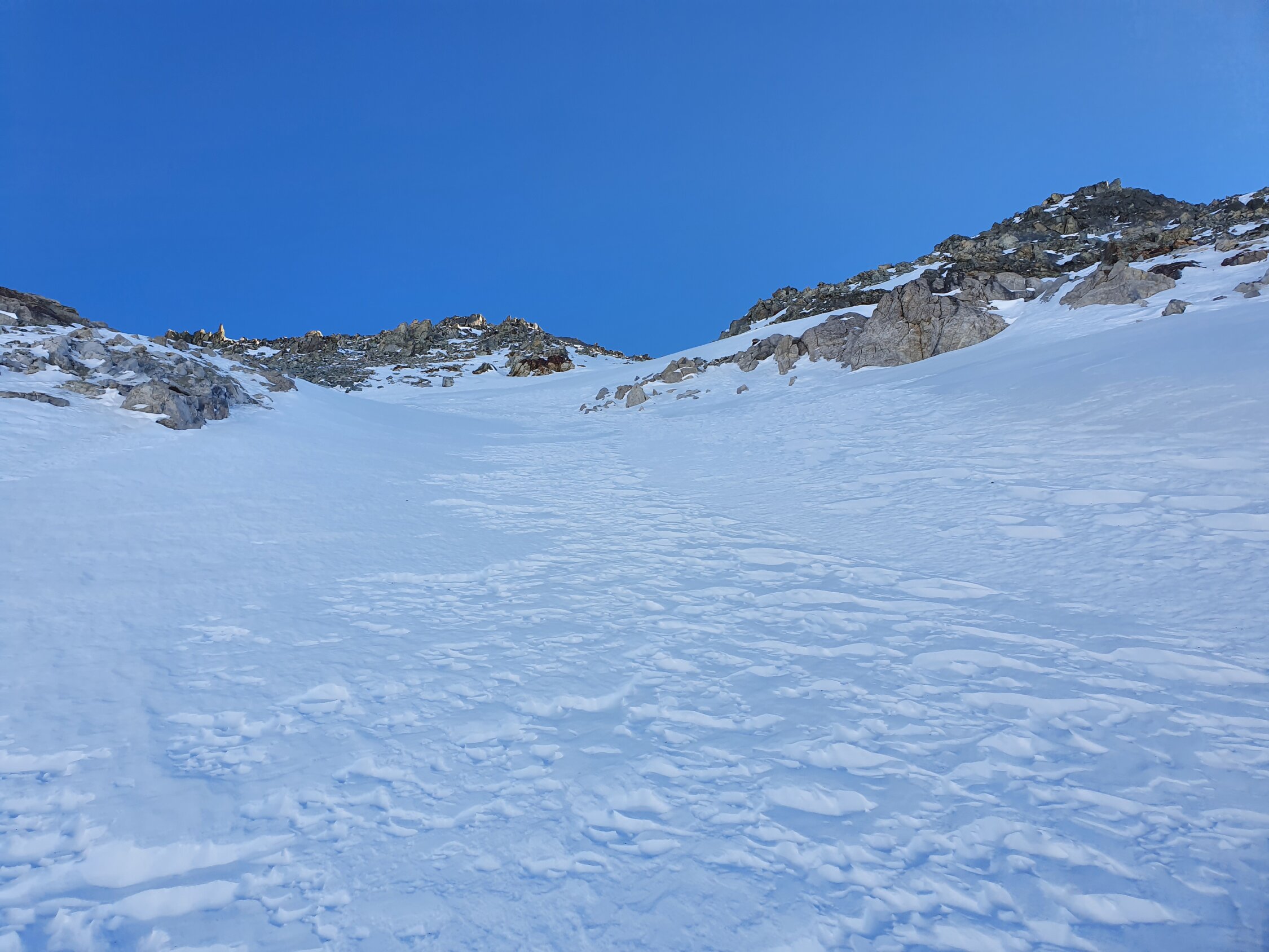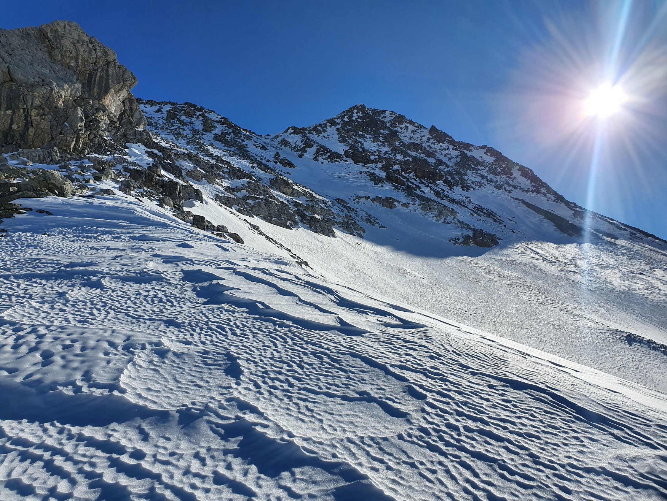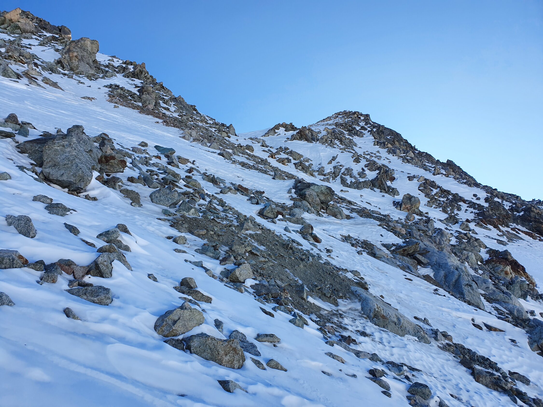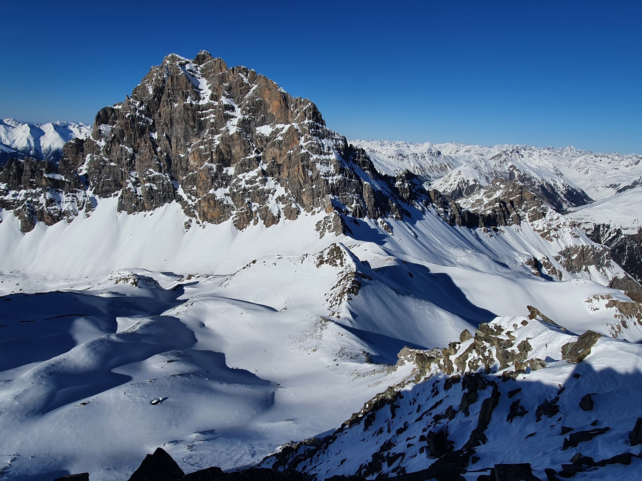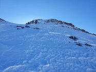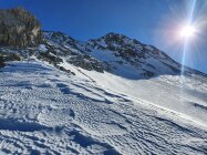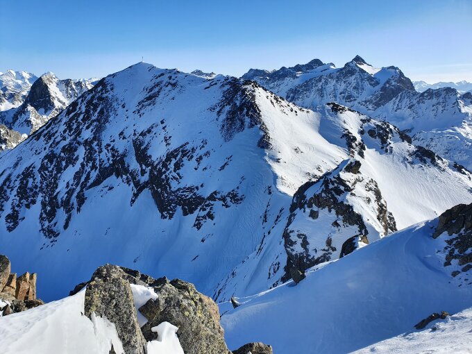 Also habe ich direkt die Cuetschens hochgespurt zu P2857. Anschliessend mit den Skis weiter möglichst lange steil dem Nordhang hoch. Aufgrund des vielen Triebschnees unten und mangel an Schnees oben bin ich ca. in der Mitte des steilen Nordhangs (ca. 35°) auf die Felsen ausgewichen. Achtung hier sind die Steine fast alle lose und mühsam zu erklettern. Auf dem Ostgrat weiter zu Fuss mit gutem Trittschnee bis zum Gipfel. Steigeisen und Pickel blieben im Rucksack.