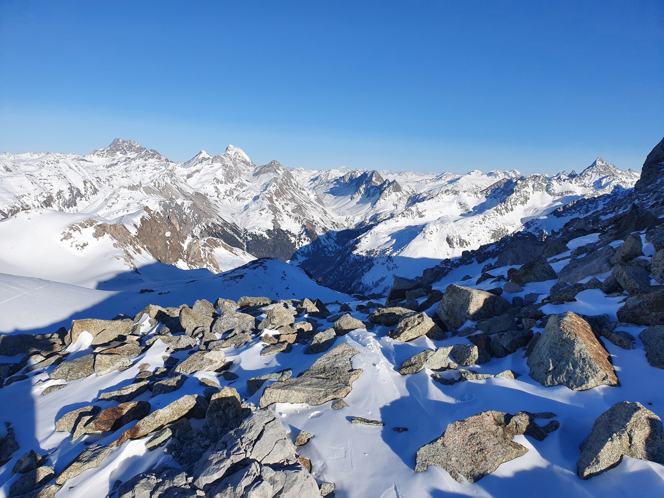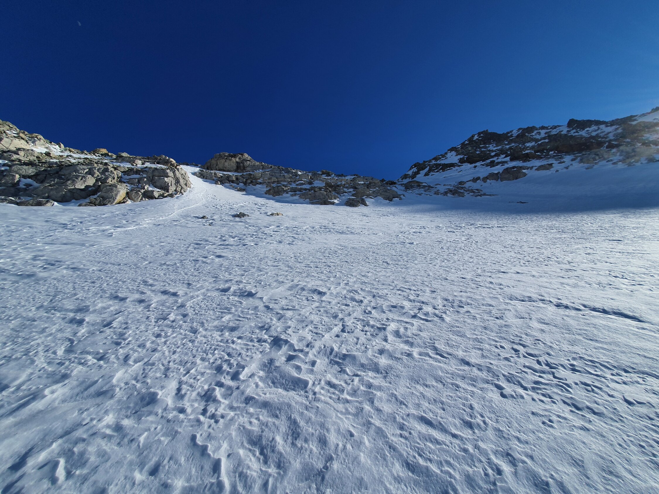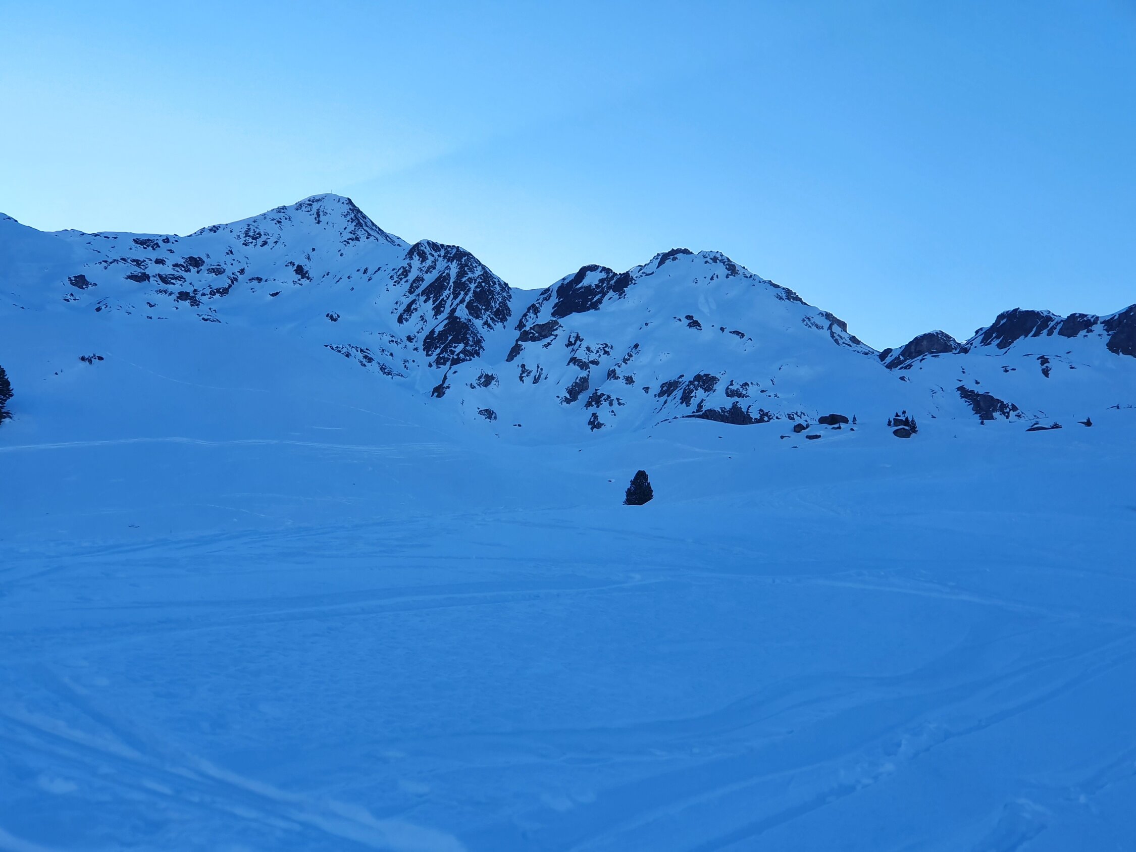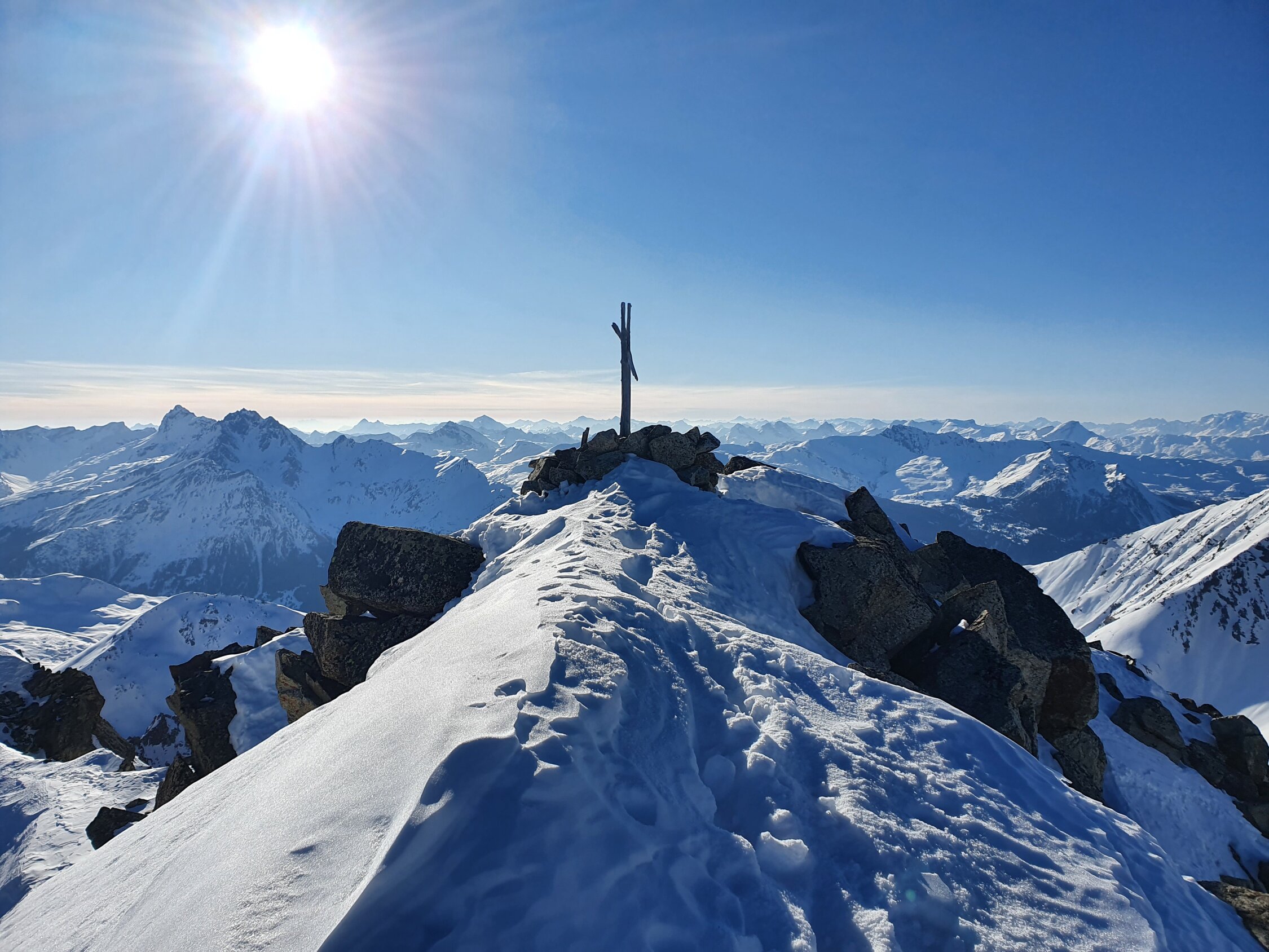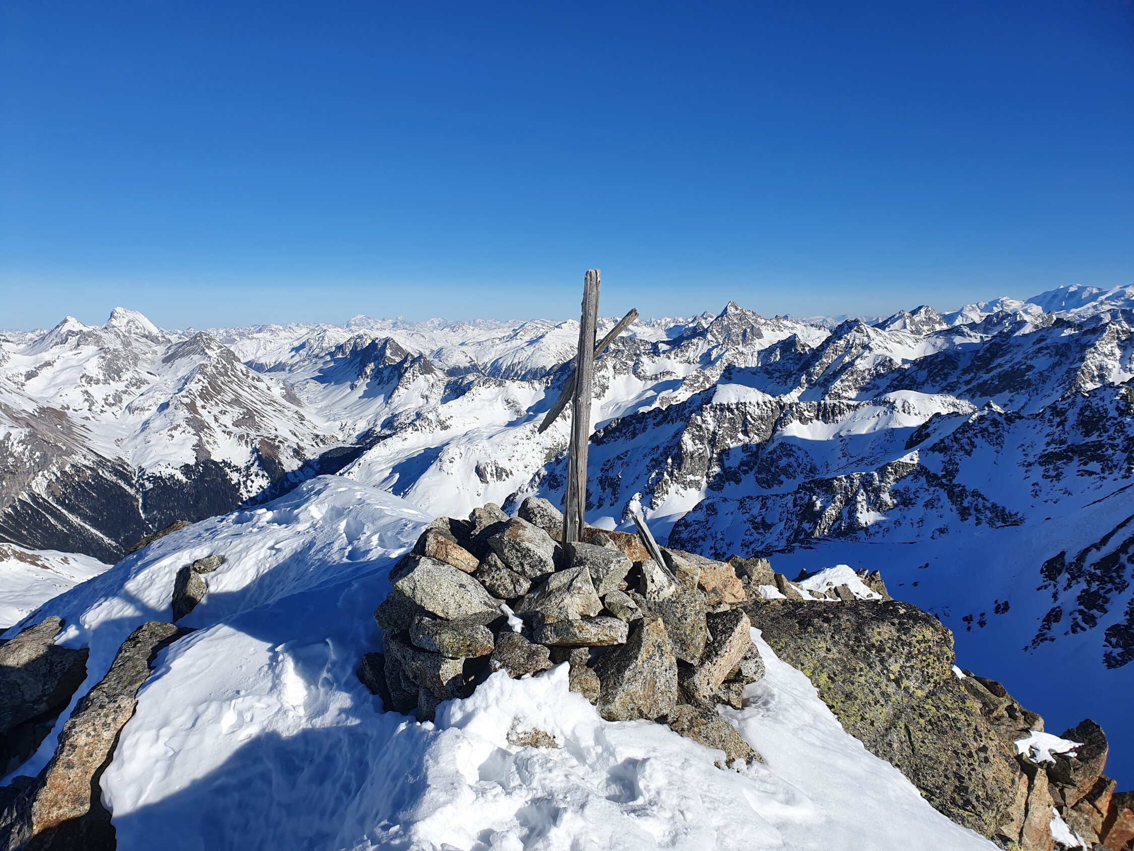 Also habe ich direkt die Cuetschens hochgespurt zu P2857. Anschliessend mit den Skis weiter möglichst lange steil dem Nordhang hoch. Aufgrund des vielen Triebschnees unten und mangel an Schnees oben bin ich ca. in der Mitte des steilen Nordhangs (ca. 35°) auf die Felsen ausgewichen. Achtung hier sind die Steine fast alle lose und mühsam zu erklettern. Auf dem Ostgrat weiter zu Fuss mit gutem Trittschnee bis zum Gipfel. Steigeisen und Pickel blieben im Rucksack.