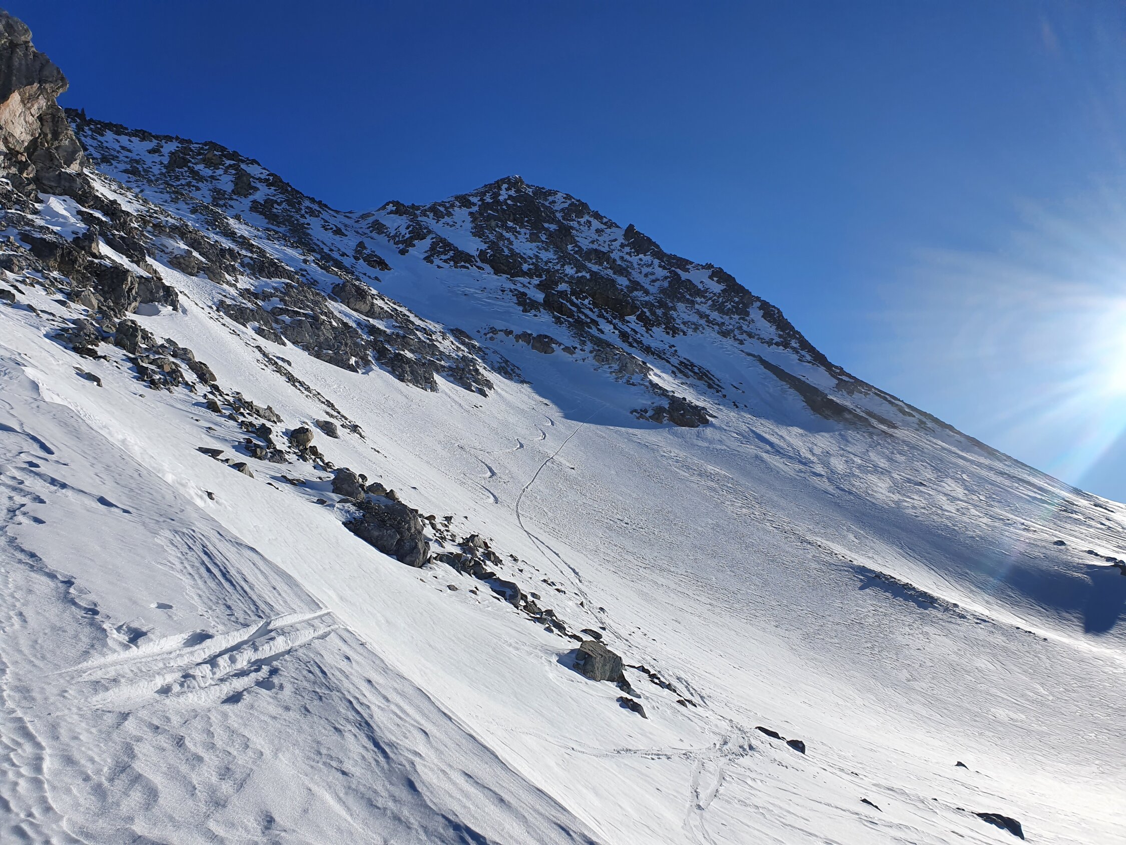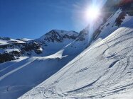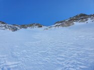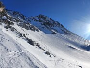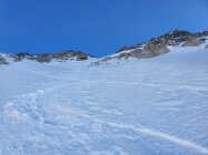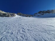 Da mir die Steine beim Aufstieg zu lose erschienen, bin ich beim Abstieg doch in der mitte der steilen Nordwand, hauptsächlich im Schnee, abgestiegen. Die Nordwand lies sich mit ein paar Schwünge doch noch auch mit den Skis geniessen.