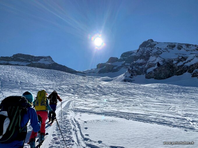 Anfangs strahlend blauer Himmel. Ab Mittag dann hohe Schleierwolken. Man merkt den Monat März denn die Sonne kommt auch schon bald auf die unteren Teile der Tour. Es hat genug Schnee auf der ganzen Route. Ganz unten beim Aufstieg auf der Piste Acht geben auf die frühmorgendlichen Pistenraser - ganz auf der Seite hochsteigen. Es hat eine gute Spur auf der ganzen Strecke. In der Steilstufe haben wir Harscheisen montiert, es wäre auch ohne gegangen.