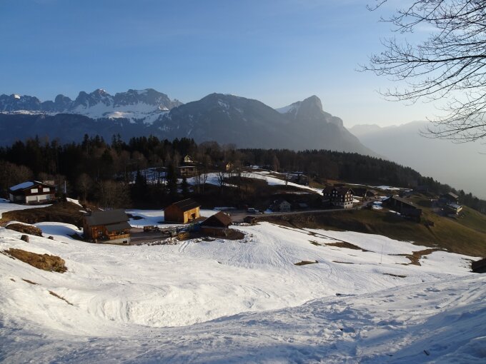 Die Schneeschuhe konnten, entgegen meinen Erwartungen, schon am Parkplatz angezogen werden. Vom Start weg bis zum Gipfel Top-Verhältnisse angetroffen! Tragende Spuren; nie eingesunken und Sonne pur. Was will man mehr?