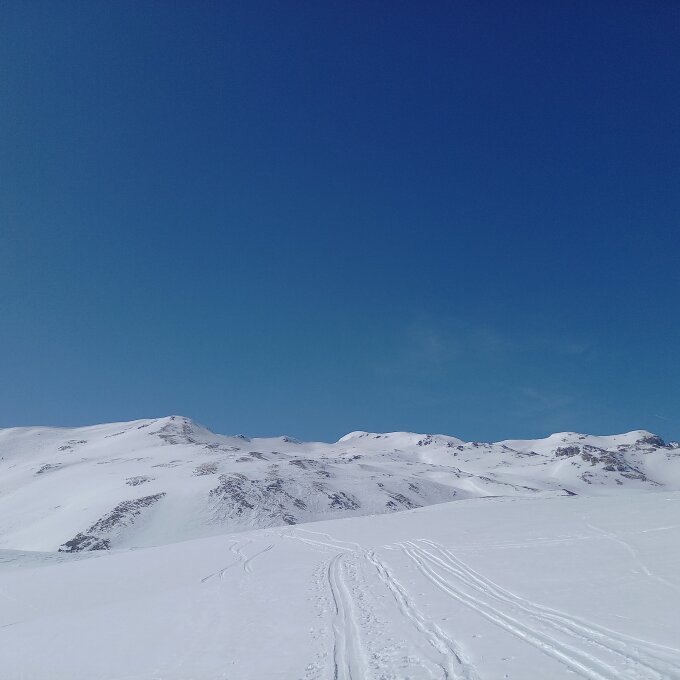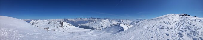 Die Abfahrt war oben top bei guter Routenwahl: schöner Pulver und noch Platz für eigene Spuren. Auf Höhe P.2452 wechselte sich dann gut zu fahrender Nassschnee mit etwas schwer drehbaren Nassschnee ab (je nach Exposition). Wir fuhren den Rücken zwischen P.2452 und P.2396 hinunter und sind dann auf die Abfahrtsspuren vom Griankopf im Griontal gequert. Danach zügig via Querfahrt und Winterwanderweg zurück zum Parkplatz.