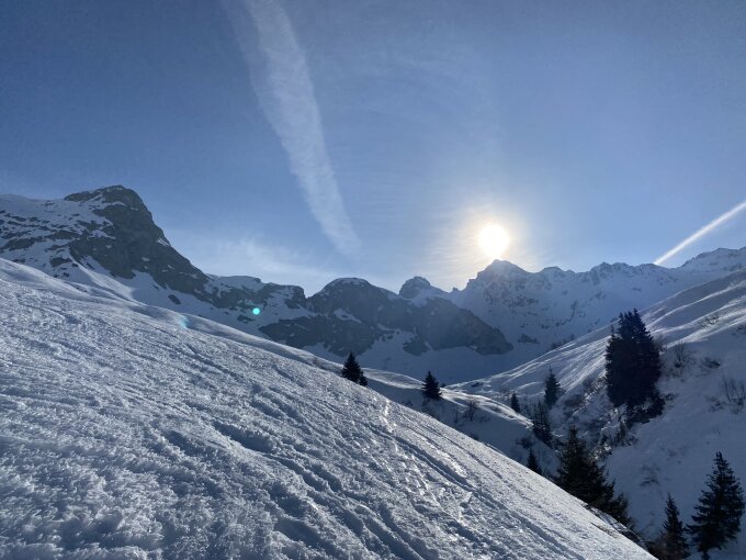 Der Schollberg und der Riedchopf verzeichnen viele Spuren. Die Abfahrt wirkt pistenartig.