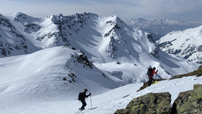 Wir sind zu Fuss die letzten 30 HM aufgestiegen. Eine Gruppe hat den Gipfel mit den Skiern erreicht. Der Gipfelgrat ist sehr schmal und abfallend. Daher Aufstieg zu Fuss sicherer