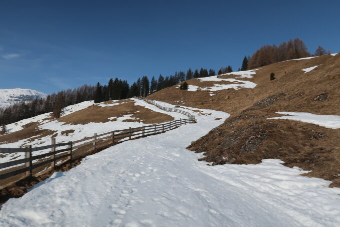 In 1-2 Wochen müssen die Ski ab Mathon wahrscheinlich ein ganzes Stück getragen werden. Auch am Zustieg zum Grat liegt stellenweise nur noch wenig Schnee.