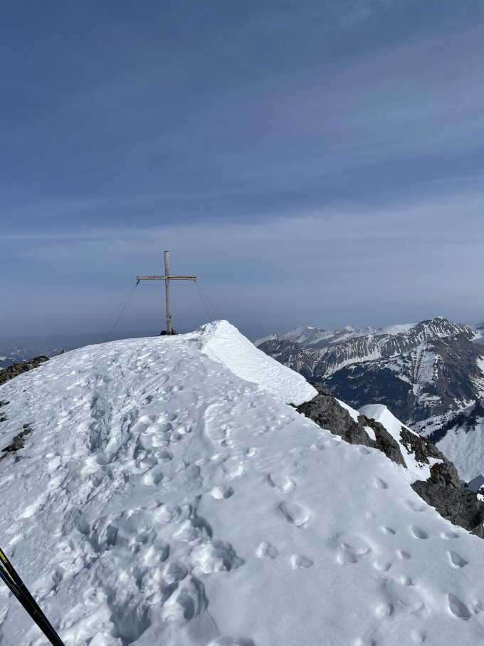 Die Verhältnisse sind gut bis sehr gut. Der letzte Hang zum Gipfel ist zum Teil hart. Harscheisen können von Vorteil sein.