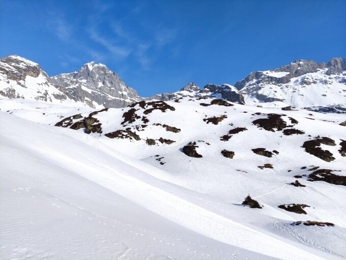 Man kann kurz nach Golzeren Bergstation im Schnee starten. Schnee in besonnten Expositionen gefroren und gut tragend (bis auf fast 2500m). Hat selbst über Mittag nur in steileren Südhängen aufgesulzt. Schneeoberfläche nicht sehr glatt, aber grossteils gut zu fahren.
