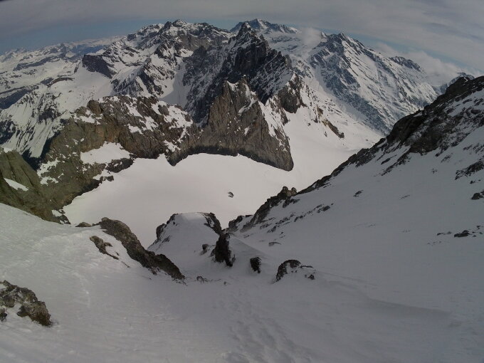 NE-Flanke: Bergschrund fast ganz zugeschneit und problemlos. Schnee in der Flanke noch pulvrig und windbearbeitet, nicht besonders viel Schnee. Einsinken bis Schuhrand und mehr. Etwas mühsame Spurarbeit. Alte Spuren von letzter Woche wahrnehmbar aber nur wenig hilfreich. Man sah noch die ausgeblasenen Abfahrtsspuren durch die Flanke. Wir haben die Ski heute nur 50hm über dem Einstieg in die Flanke zurückgelassen.