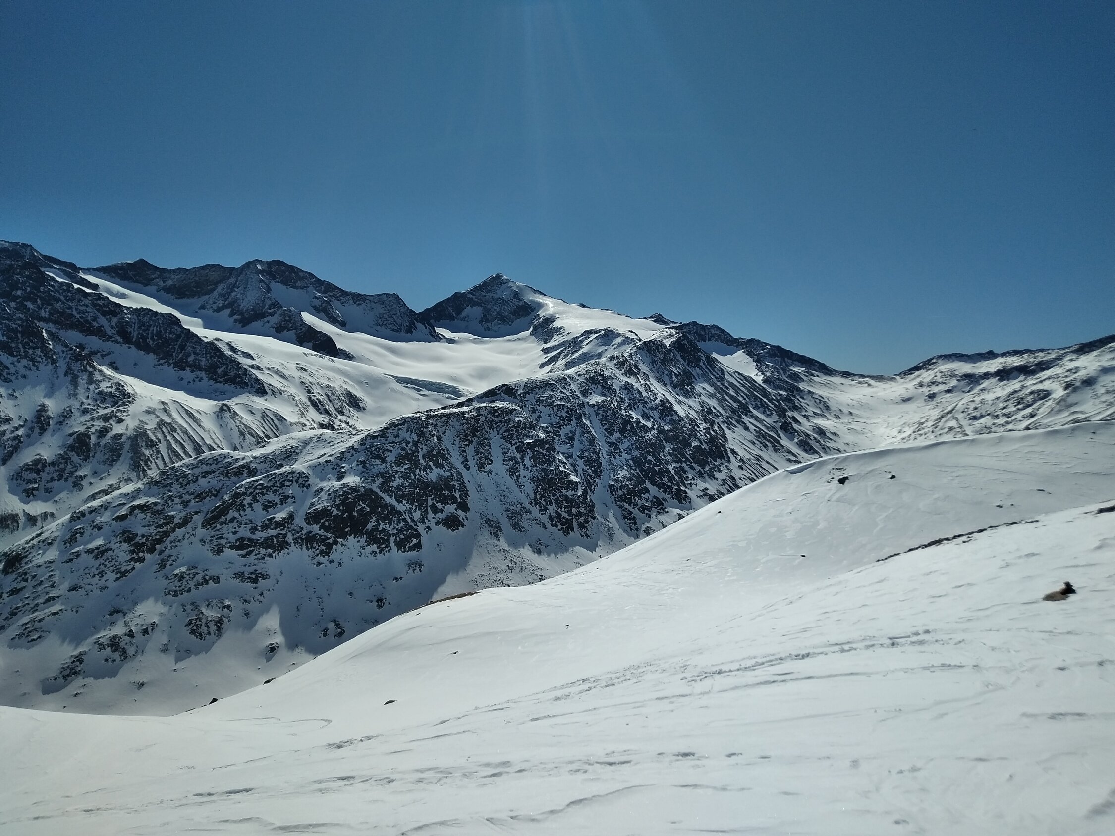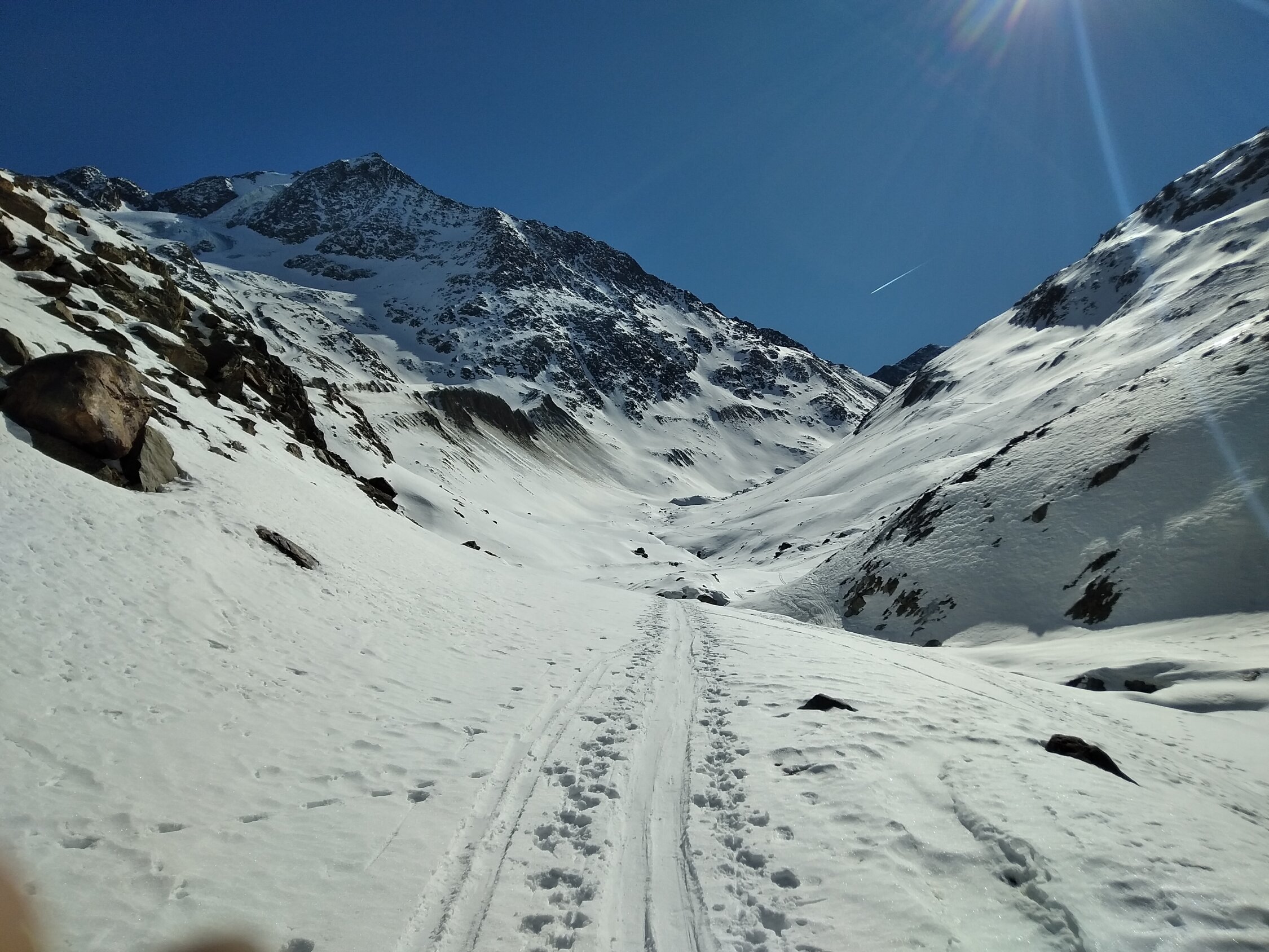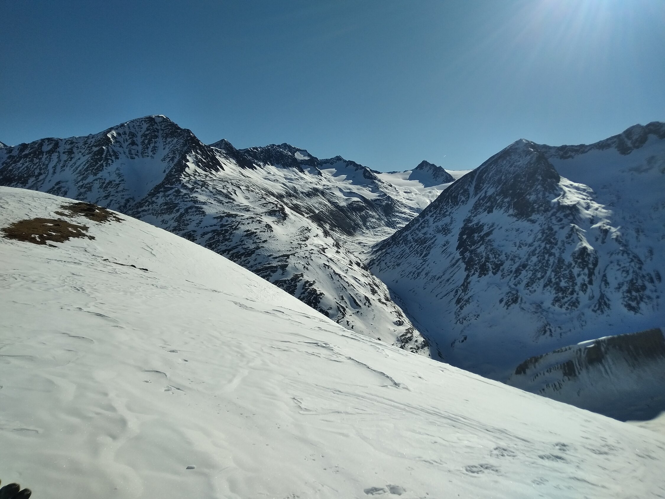 Martin Busch-Hütte - Kreuzspitze Je nach Schnee- bzw Lawinenverhältnissen entweder entlang des Sommerweges oder mit etwas weniger Hangneigung 4oo Meter südlich von der Hütte beginnend zur den Brizziseen und dann ungefähr dem Soommerweg gfolgend in den Sattel.