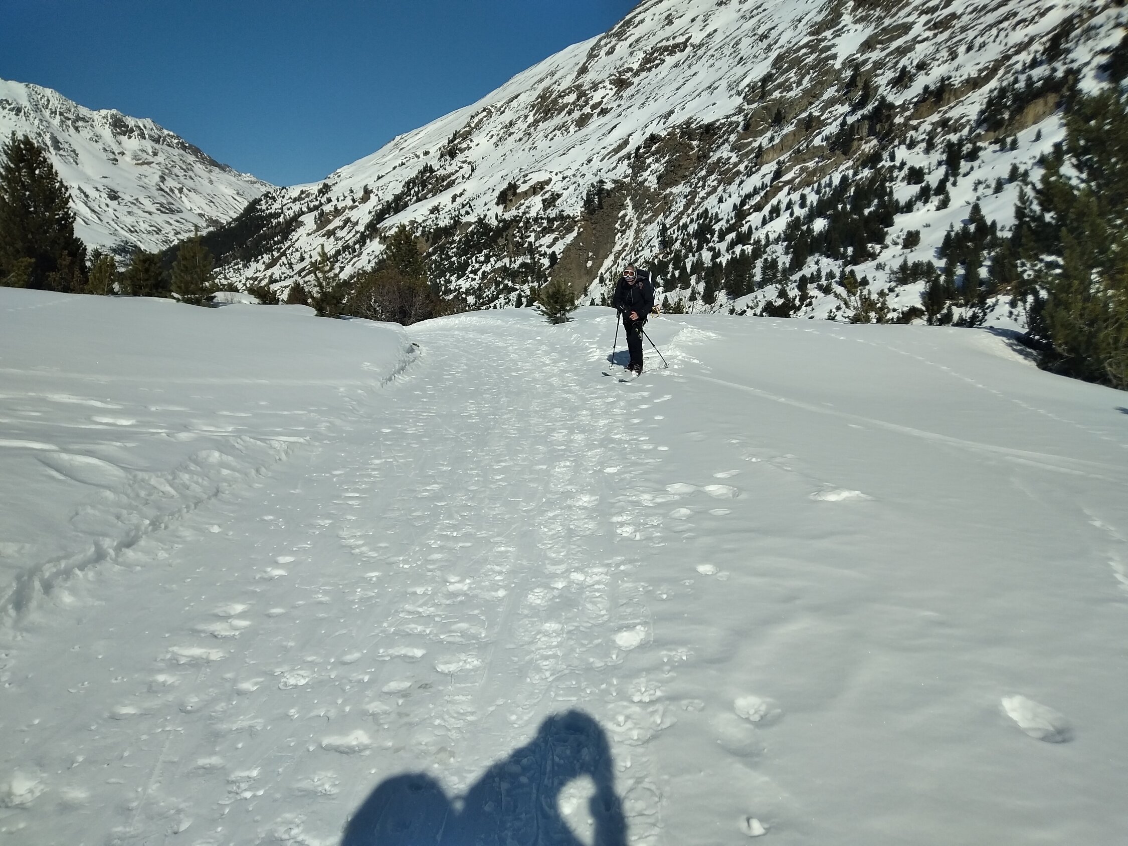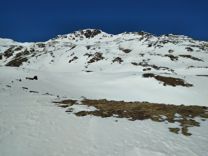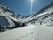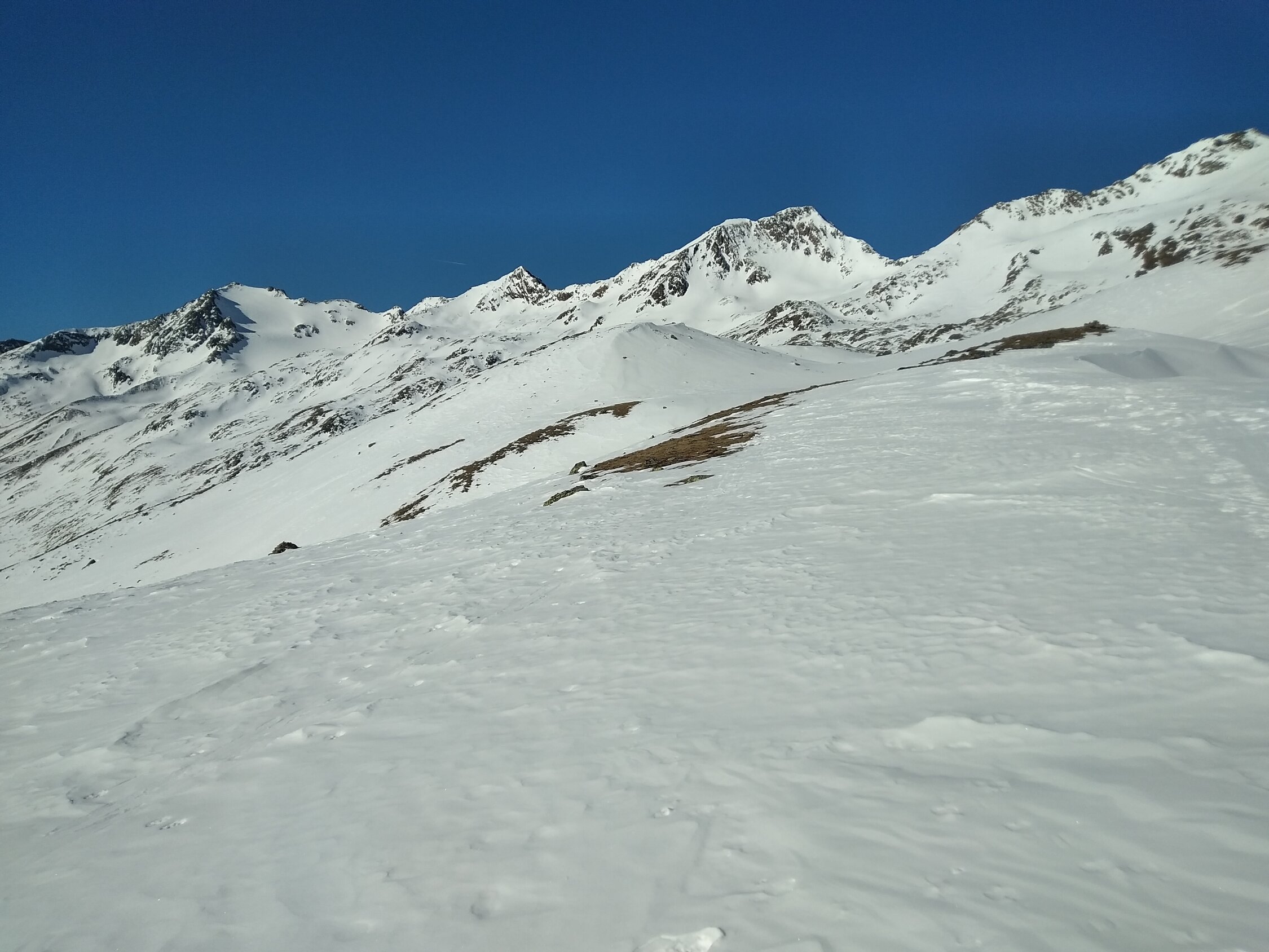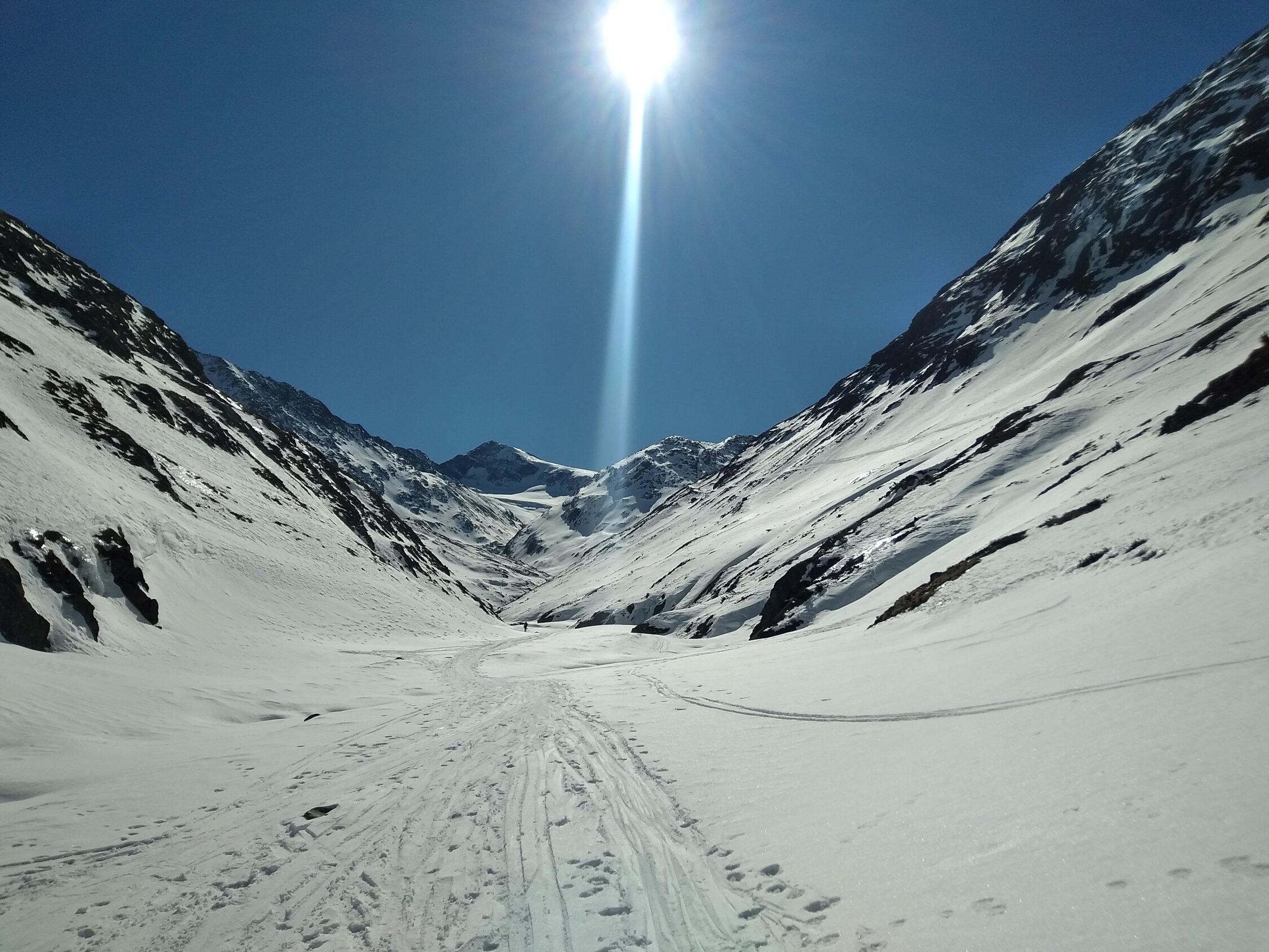 Martin Busch-Hütte - Kreuzspitze Je nach Schnee- bzw Lawinenverhältnissen entweder entlang des Sommerweges oder mit etwas weniger Hangneigung 4oo Meter südlich von der Hütte beginnend zur den Brizziseen und dann ungefähr dem Soommerweg gfolgend in den Sattel.