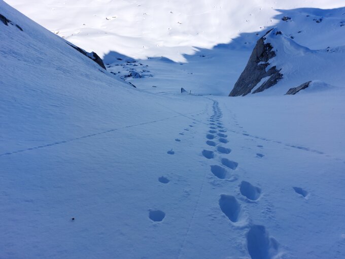 Start in Tschuggen bei starkem Wind, welcher ab der Passhöhe merklich nachliess. Aufstieg über Schwarzkopf, im Talkessel dann windstill und frühlingshaft warm. Zustieg in die Rinne luftiger Pulver, Skidepot auf 2820, dann 250 Höhenmeter Spurarbeit. In der Rinne wenig Schnee unten mit vielen Steinen, in der Mitte Bruchharsch und oben feinster Pulver, was die Spurarbeit merklich erschwerte. Auf dem Gipfel nur schwachwindig, Rückweg über das Radüner Rothorn und Schwarzkopf. Hat noch einige Pulverhänge nordseitig.