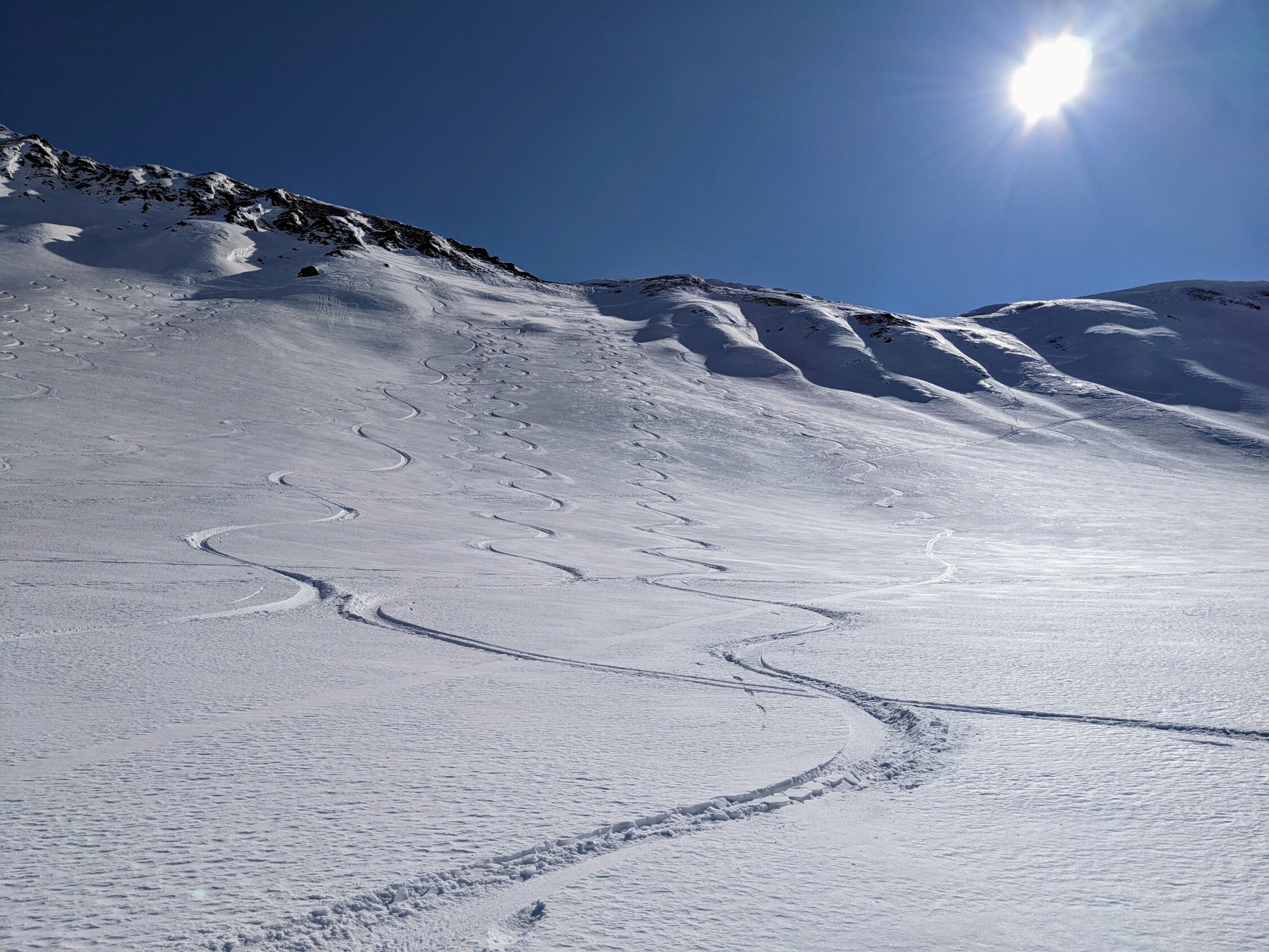 Anschliessend Aufstieg vom Alteinsee in Richtung Alteiner Fürggli, unterhalb Strel scharf links über den Oberberg zu den Nordhängen der Amselegg. Top Pulver. Danach zu den Nordhängen des Schiesshorns traversiert. Auch hier wieder leicht gepressten aber sehr schön fahrbaren Pulver gefunden bis weit in die Legföhren hinein. Via Furggatobel Bachbett (eher mühsam) raus Richtung ARA.