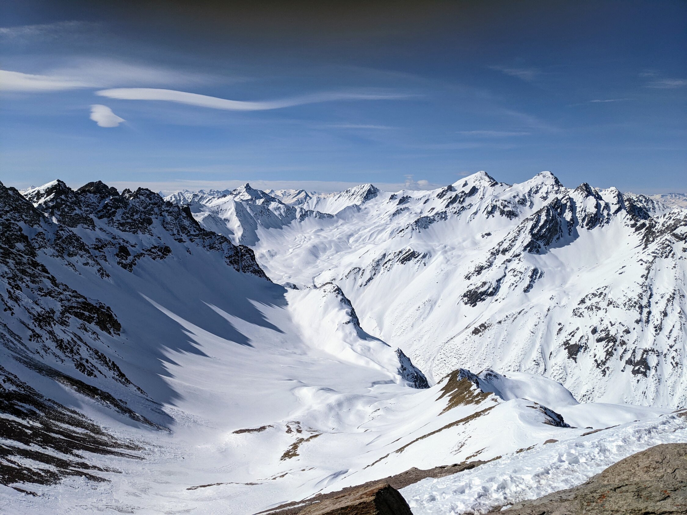 Aufstieg über ARA, Alteiner Wasserfälle, Uf Altein, Alteinsee, Jammertäli zum Gipfel. Der Wind hat ziemlich stark gearbeitet die letzten Stunden und Tage. Ab der 2. Steilstufe zu den Alteiner Seen sind Harscheisen Pflicht geworden. Am Gipfelgrat aktuell zwingend. Die letzten 150 Meter (15-20 Höhenmeter) am Grat müssen die Skier getragen werden, kein Schnee auf dem Gipfel. Abfahrt in der Nordflanke sicher, haben eine schöne Mulde mit Pulver gefunden, welcher kurz zu ziemlichem Presspulver wird um dann im unteren Teil vom Hang wieder schön pulvrig zu werden. Praktisch kein Triebschnee vorhanden, da auf dem Gipfelgrat kaum mehr Schnee ist.