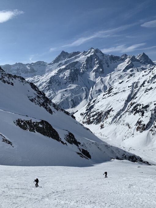 Wir haben uns für den Übergang vom Meiental ins Engelbergertal entschieden. Sind deshalb mit dem ÖV und Schneetourenbus angereist, Start der Tour somit verhältnismässig spät um 08:30 in Färnigen. Aufstieg über Steilstück unterhalb Chüefadfirn trotz Hartschnee geht mit Harscheisen und entsprechender Übung gut. Auf dem Chüefadfirn war der Schnee dann bereits leicht aufgesulzt. Für die Querung vom Chüefadpass zum Spannortjoch haben wir die Felle aus Zeitgründen drangelassen, was die erste kurze Abfahrt mit harten und verblasenem Schnee etwas schwierig gestaltete, jedoch machbar war. Der Aufstieg vom Skidepot zum Gipfel war trotz fortgeschrittener Tageszeit (Start Skidepot kurz vor 14:00) mit Steigeisen und Pickel gut machbar. Das mitgenommene Seil haben wir nur zum Abseilen über die zweite Felsstufe im Abstieg verwendet.
