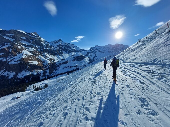 Die Strasse ab Parkplatz Tschingel bis Griesalp ist stark vereist und hat schon viele apere Stellen. Ab Griesalp bis zum Gipfel hat es eine ausgezeichnete Aufstiegsspur. Harscheisen waren heute nicht nötig.