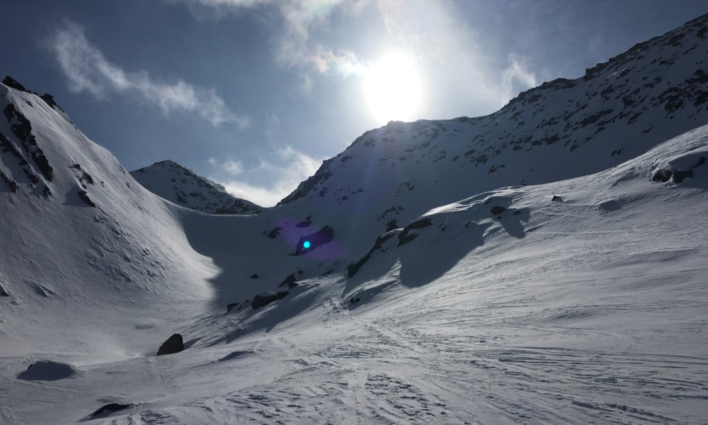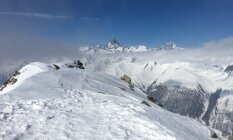 sehr windig (Föhn), aber bis auf wenige Ausnahmen wegen der NE-Exposition des Aufstiegs erträglich. Schneemässig sehr abwechslungsreich, von allem etwas aber insgesamt besser als zu erwarten gewesen wäre, allerdings fahrerisch recht anspruchsvoll. ACHTUNG: die offizielle Route über die "westliche Blaslücke" bei Pkt. 2736 ist nicht zu empfehlen, da er stark ausgeapert ist und etliche Felsen im Weg stehen; besser vorher, auf dem Sattel südlich des Felsturms von 2666m Skidepot machen und mit Pickel und Steigeisen rund 100Hm steil aber angenehm aufsteigen. Dadurch reduziert sich auch der Horizontalweg auf dem Grat.