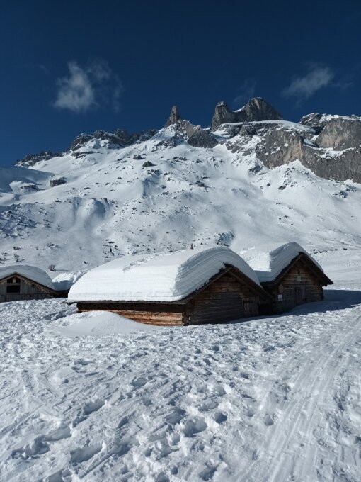 Drei Türme sind Traumkulisse. Vom Gipfel herrlicher Blick ins tief-winterliche schweizerische St. Antönien u. Schweizer Bergwelt.
