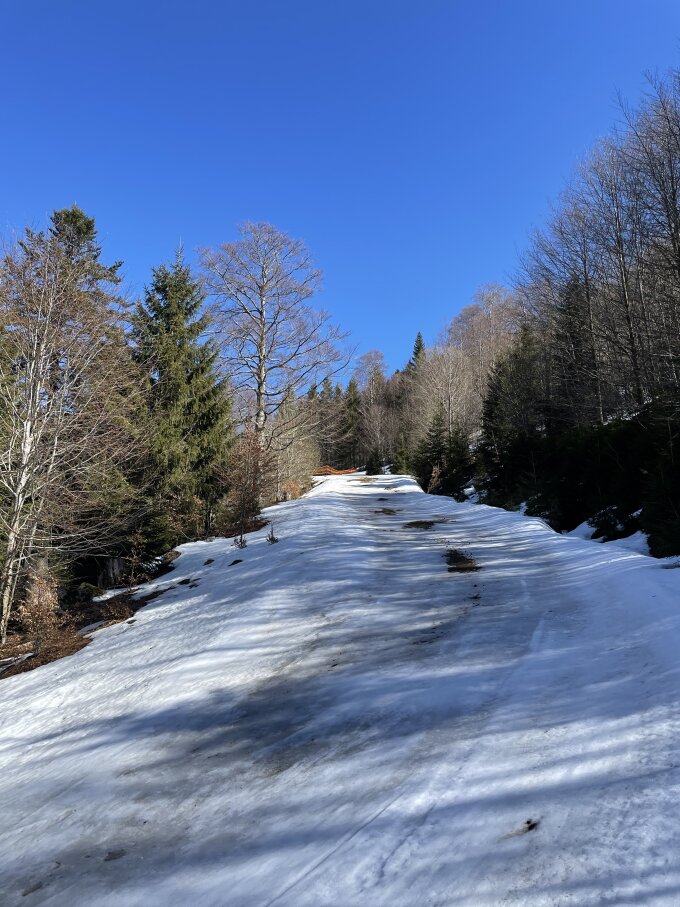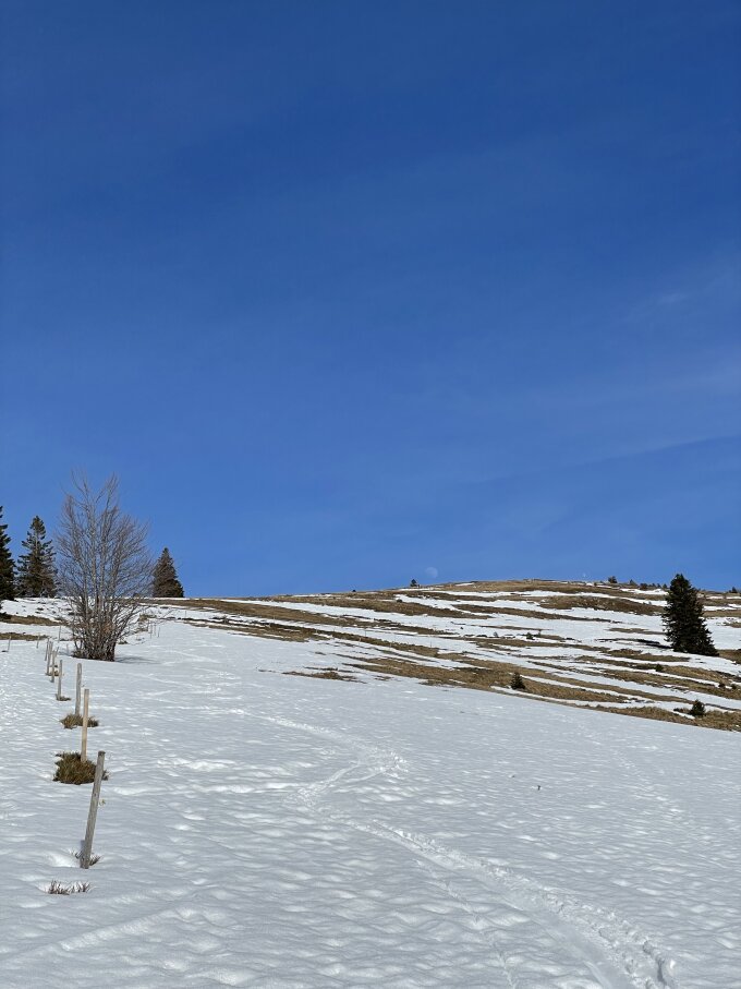 Start bei der Talstation der Rothausbahn, und wenn man da ankommt, glaubt man nicht, dass noch was möglich sein soll, so Frühling herrscht hier. Aber nach 100 Meter Skitragen kann man über die heute weitgehend leeren Pisten aufsteigen, oben bei Grafenmatt sogar 0,5 cm Neuschnee (dochdoch)! Am Schatten trotz Wärme gefroren, an der Sonne weich. Weiter von Grafenmatt zum Herzogenhorn via Glockenführe, dann schöööne Pause mit Alpensicht und ohne Wind. Abfahrt via den Gipfelhang ganz rechts von oben und dann weiter durch den Wald zum Prägbach runter. Schöne Route, heute oben Topfirn, weiter unten bisschen klebrig. Wiederaufstieg zum Herzogenhorn und Abfahrt zur Glockenführe, das war wegen Nordexpo heute das Beste. Aber wie alles Schöne zu kurz... dann rauf zur Grafenmatt und via Piste runter zum Auto, naja man konnte immerhin fahren bis unten, aber spätnachmittags ist das natürlich nicht mehr sooo toll. Der Pflichtteil halt.