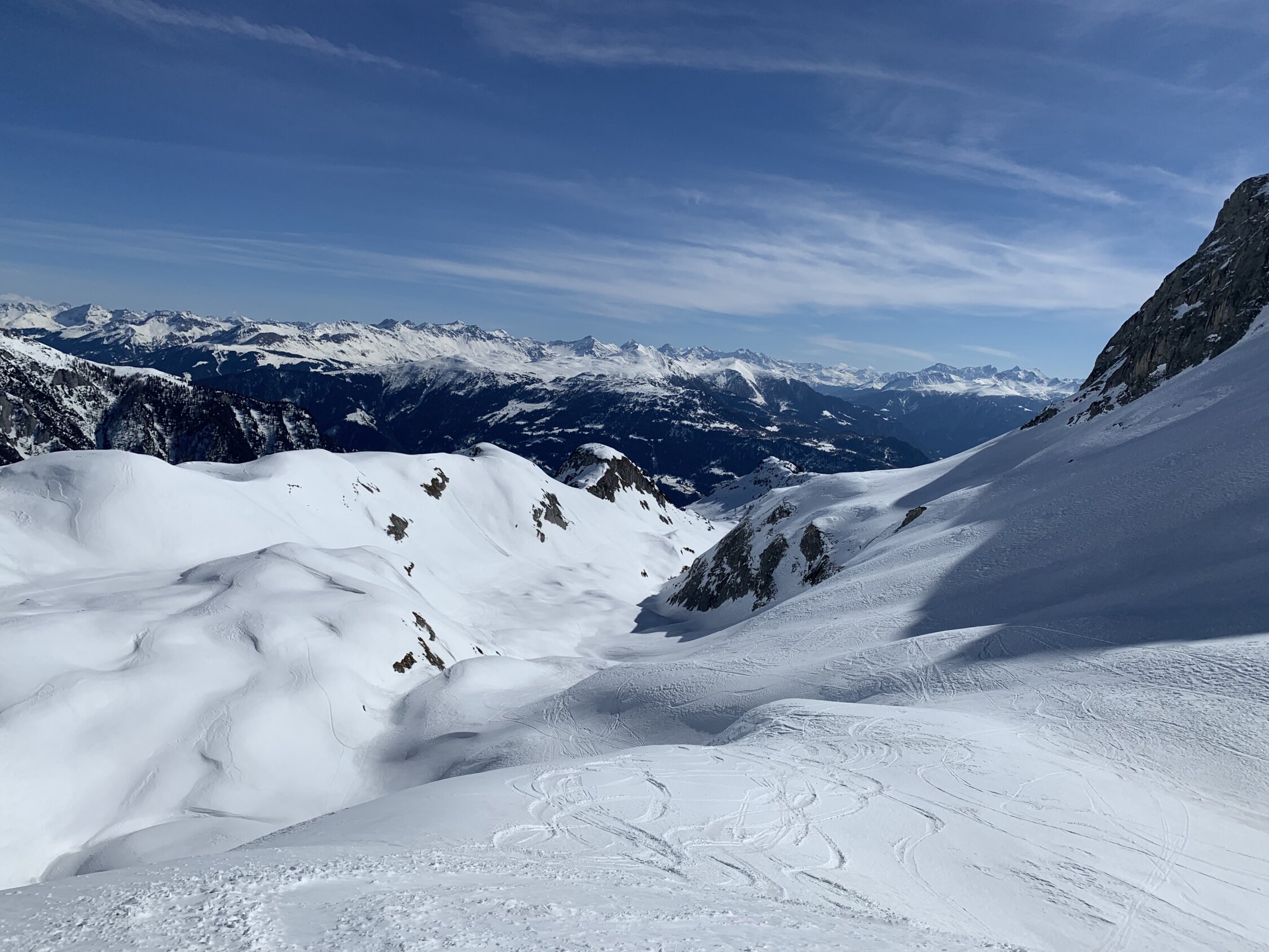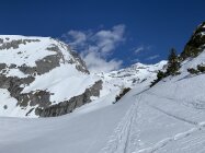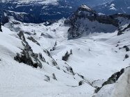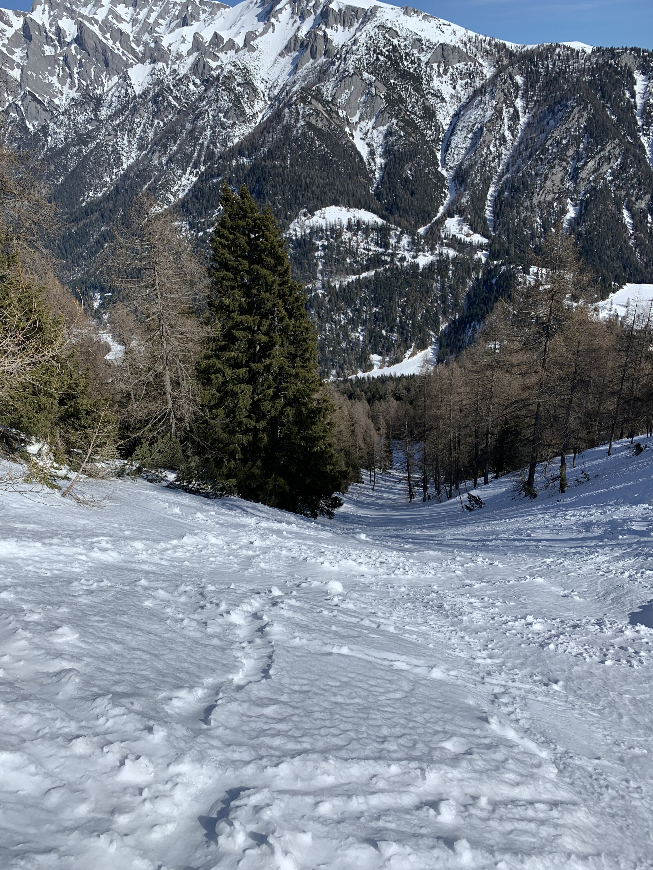 Abfahrtsspass hielt sich in Grenzen, es sulzt noch nicht richtig auf. Im Wassertobelcouloir dann Mischung aus verkrusteten Nasschnee, Hartschnee und Pulverresten - auch nicht wirklich super. Kunkelstrasse retour dann auf Loipe gut.