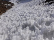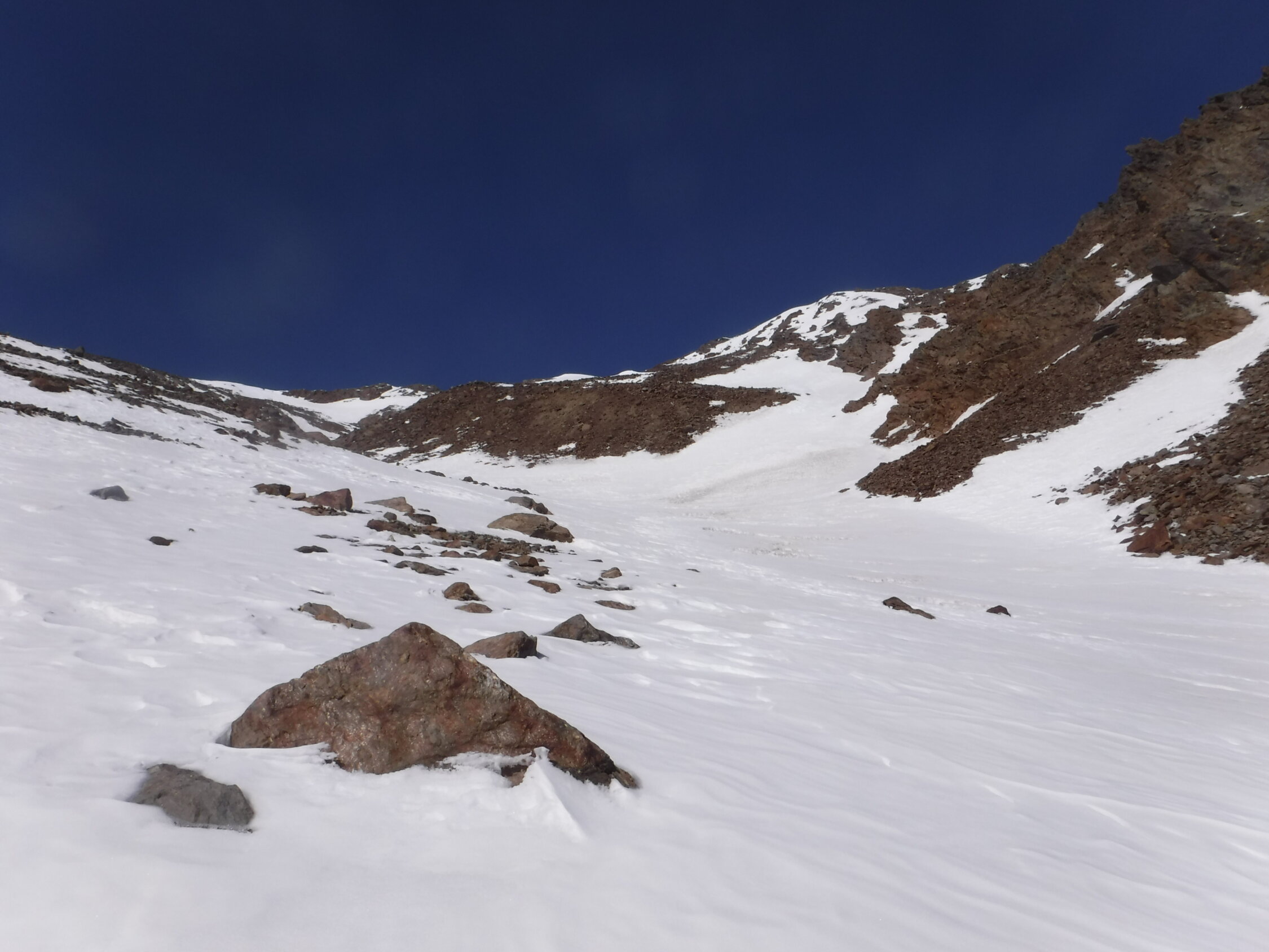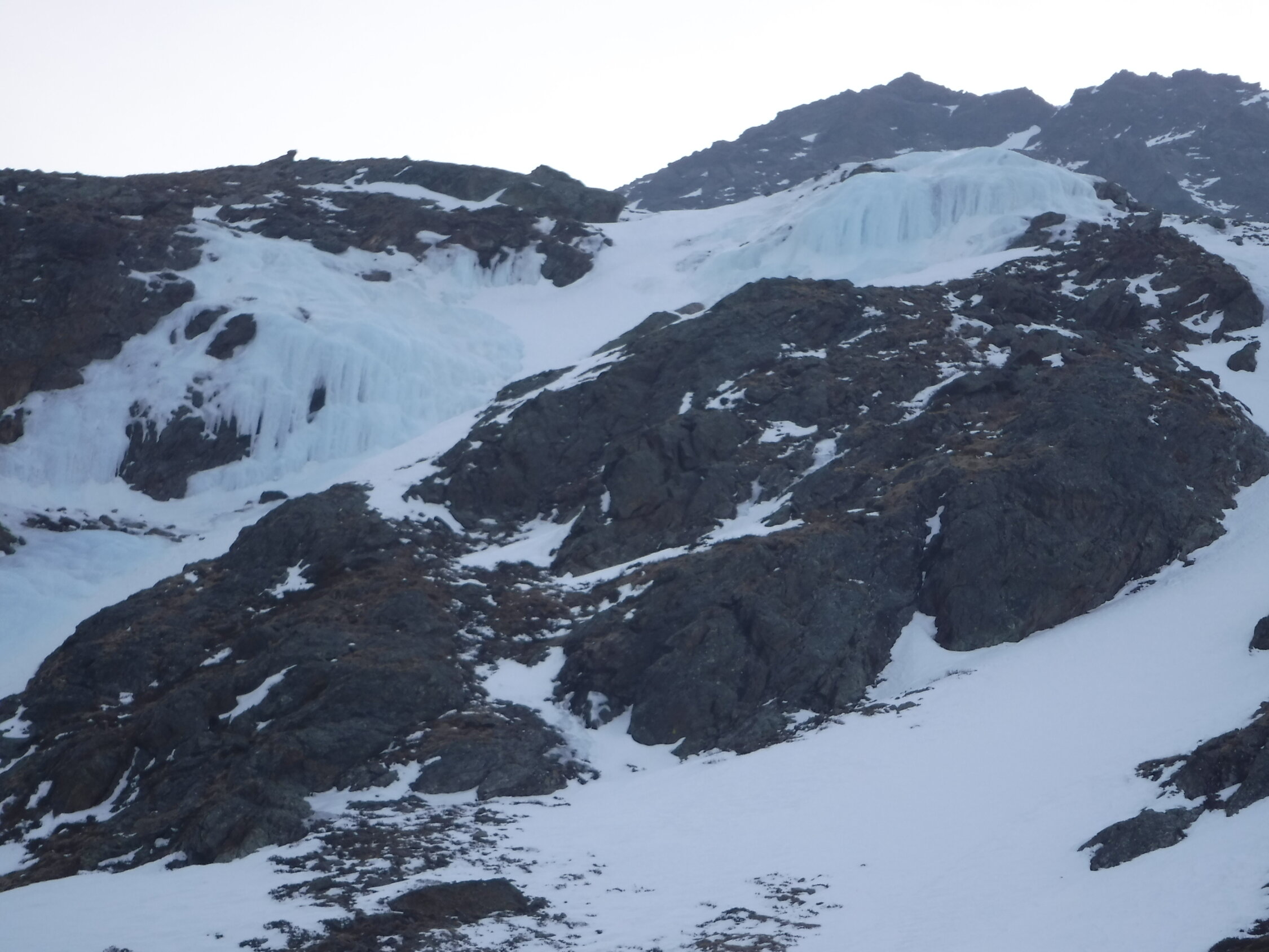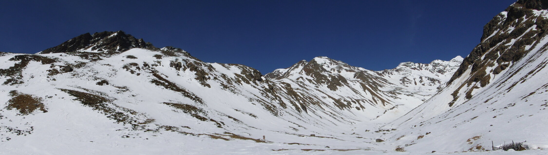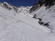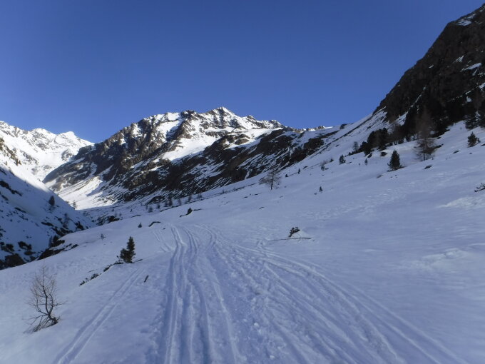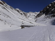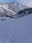 Im Abstieg muss man aufpassen, nicht der Verlockung zu erliegen, dem Sommerweg folgen zu wollen entlang des Nördl. Gawelzbaches (rot-weiße Markierungen) durch anfangs unsteile, flache Mulde. Dieser führt jedoch zu einer im Winter vereisten, steilen Felsschwelle. Ich machte diese Erfahrung und musste insofern nach Norden ausweichen und steil absteigen in Richtung Garten zum sichtbaren Weg vom Matscher Jochsee kommend, was einen Umweg bedeutete. Für diesen Abstiegsverhauer zog ich lieber dann die Steigeisen an.